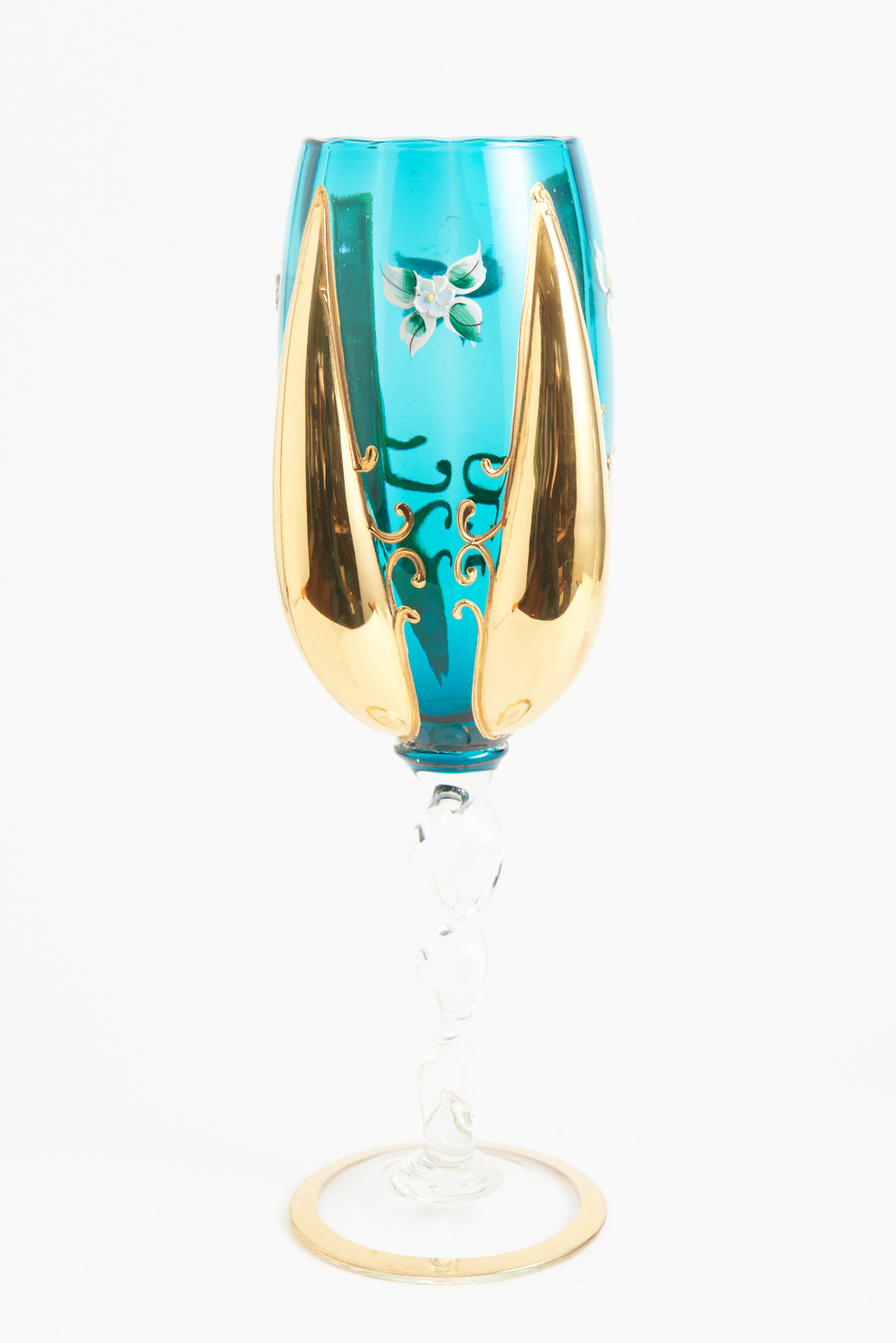 A VENETIAN GILT AND ENAMELLED GLASS VASE, WITH A FLUTED BODY AND A BARLEY TWIST STEM, 39 CM HIGH, LEONARD JOEL LOCAL DELIVERY SIZE: SMALL