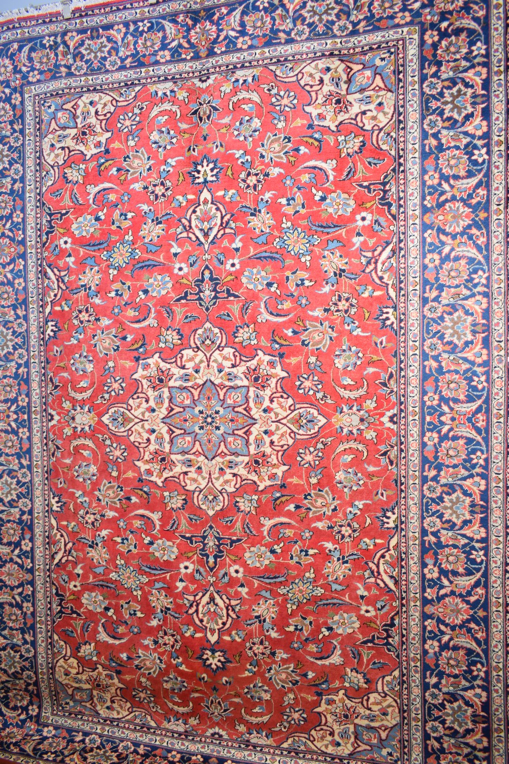 A SUPERB PERSIAN ISFAHAN NAJAFABAD CARPET. 100% FINE DENSE WOOLEN PILE. FINELY HAND-KNOTTED & WITH CLASSIC ISFAHAN DESIGN OF FLORAL MEDALLION & QUARTERED CORNER MEDALLIONS IN A RED FIELD OF 16TH CENTURY SHAH ABBAS PALMETTES, FLOWER HEADS & SAZ LEAVES. BORDER OF PALMETTES & SAZ LEAVES. EX-GALLERY EXHIBITED. IN MAGNIFICENT CONDITION. CERTIFICATE OF AUTHENTICITY INCLUDED. SIZE: 343X237CM ORIGIN: PERSIA - RRP: $4,400 (LEONARD JOEL DELIVERY SIZE: LARGE)