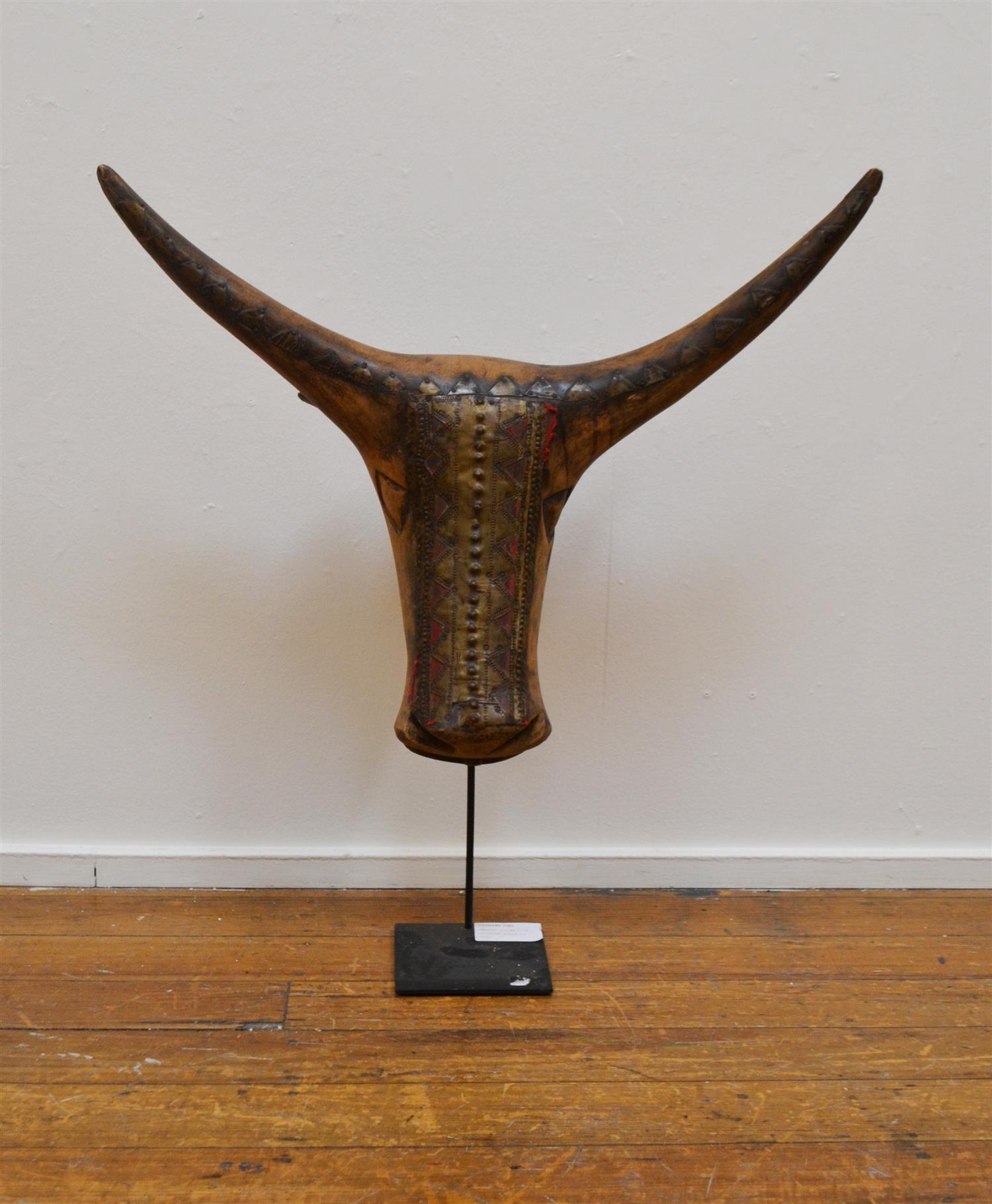 UNKNOWN ARTIST (WEST AFRICAN), BUFFALO MASK, WOOD CARVING ON STAND, 40 X 74CM (MASK, EXCL. STAND), CONDITION: WORK IN GOOD CONDITION, WITH WEAR TO THE TIMBER AND IS STRUCTURLEY SOUND. LEONARD JOEL DELIVERY SIZE: LARGE