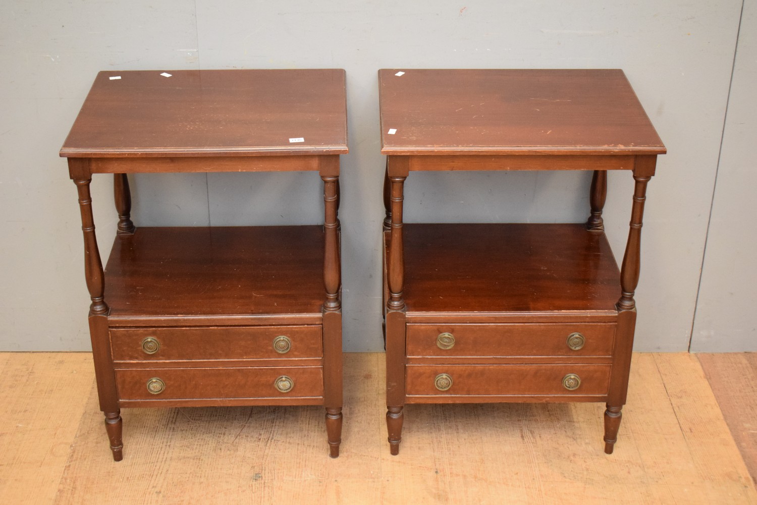 A PAIR OF TWO TIER BEDSIDES (A/F) (71H x 51W x 40D CM) (LEONARD JOEL DELIVERY SIZE: MEDIUM)