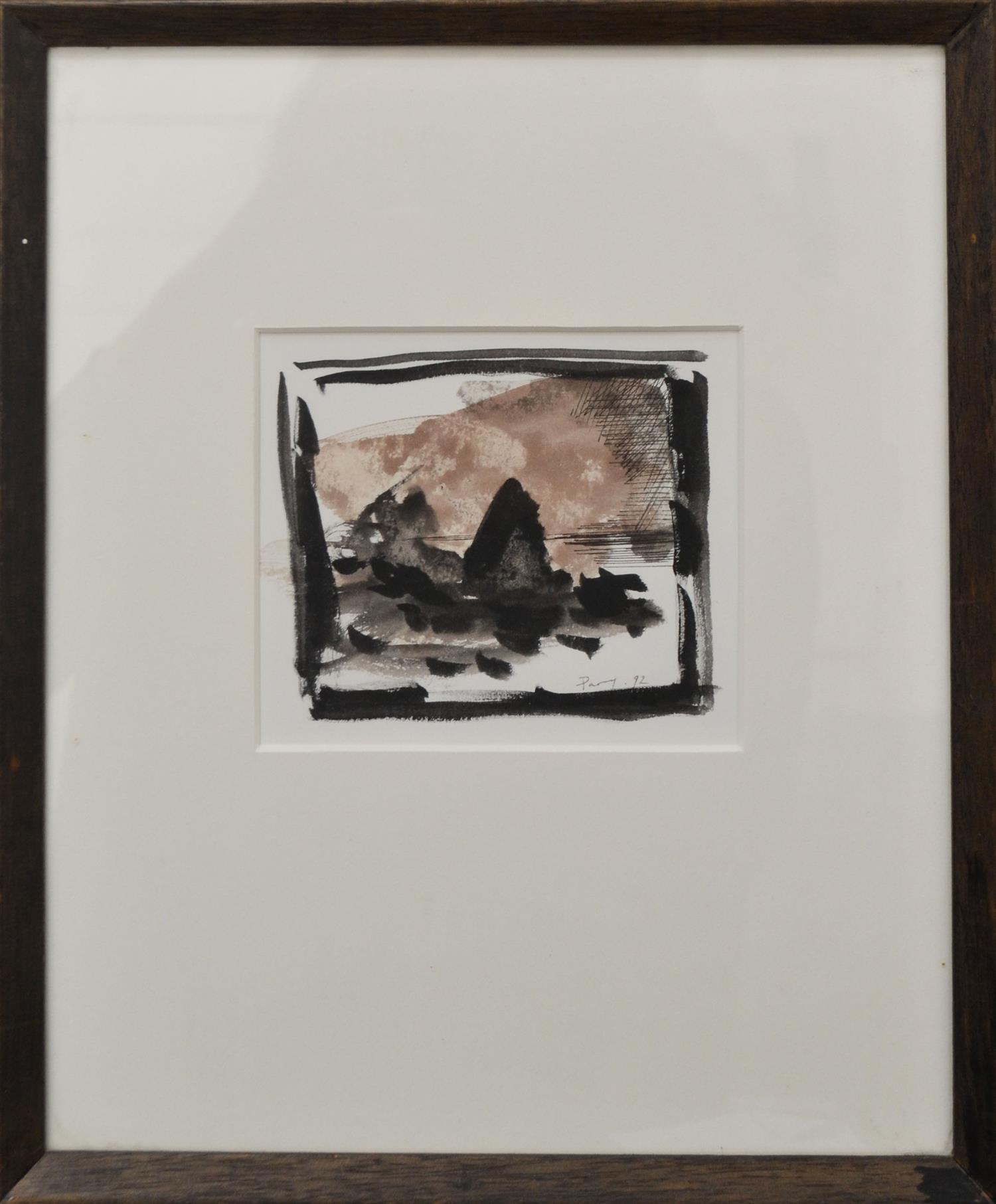 IAN PARRY, LANDSCAPE 1992, INK ON PAPER, 9 X 11CM, FRAME SIZE: 30 X 25CM, CONDITION: VERY GOOD, LEONARD JOEL DELIVERY SIZE: SMALL