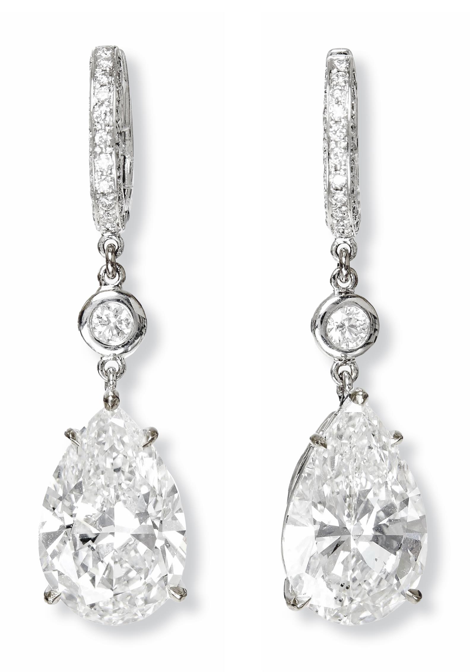 Each terminating on a claw-set pear-shaped diamond swing drop weighing 5.03 carats and 5.01 carats respectively, suspended from a half hoop surmount pavé-set with brilliant-cut diamonds between a spectacle-set diamond connector, length approximately 45mm, post and clip fittings.