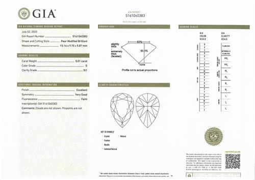 a GIA report numbered 5161040383, dated 2 July 2020, stating that the 5.01 carat diamond is natural, G colour, SI1 clarity, laser inscribed.