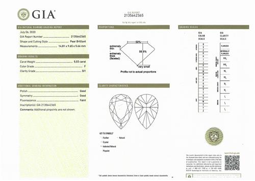 a GIA report numbered 2135642365, dated 6 July 2020, stating that the 5.03 carat diamond is natural, F colour, SI1 clarity, laser inscribed;