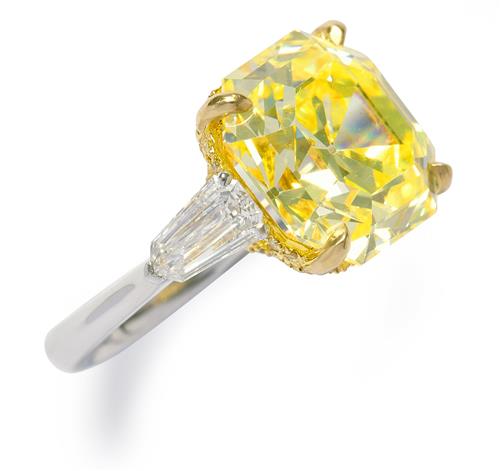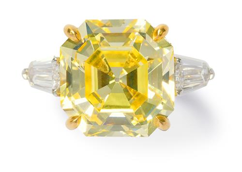 Of cluster design, centring a cut-cornered square step-cut fancy yellow diamond weighing 10.65 carats, claw-set in an openwork undercarriage decorated with 58 pavé-set brilliant-cut diamonds together weighing approximately 0.25 carat, shouldered by two claw-set trapezoid diamonds each weighing approximately 0.80 carat, size L.