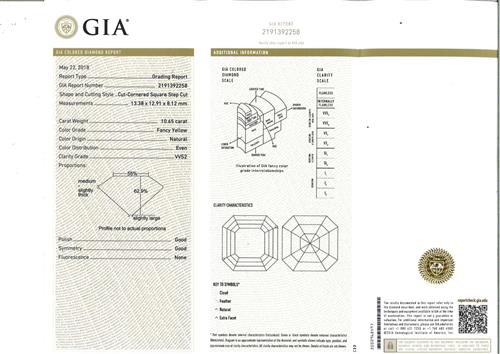 Accompanied by a GIA report numbered 2191392258, dated 22 May 2018, stating that the 10.65 carat diamond is natural, fancy yellow colour, VVS2 clarity.