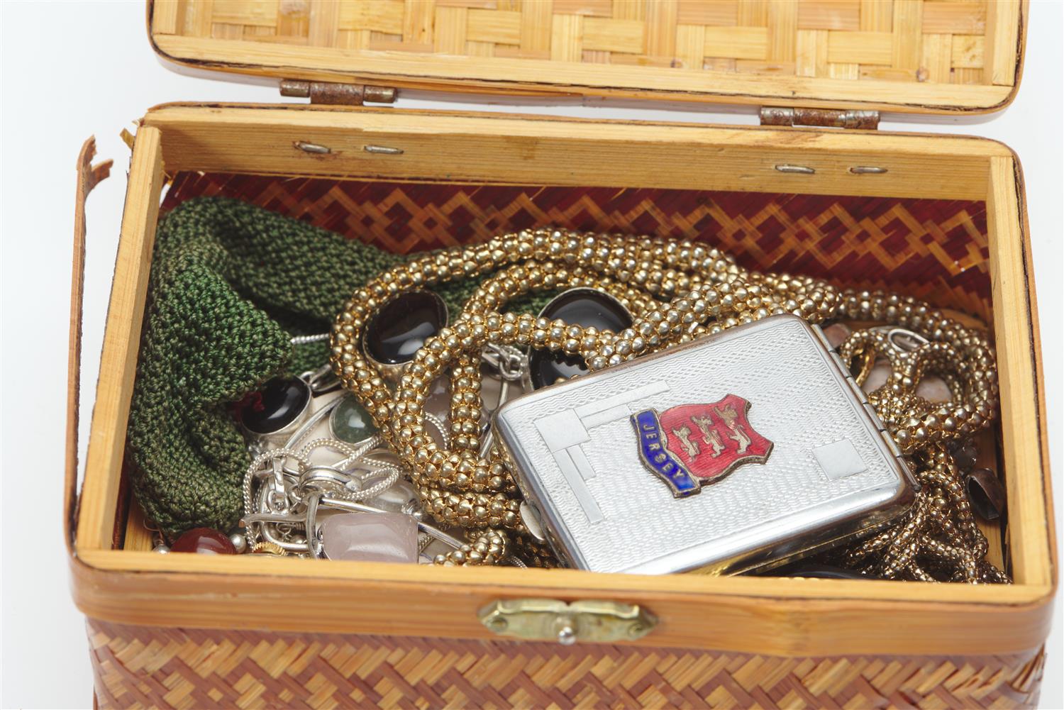 A BOX COMPRISING A COLLECTION OF JEWELLERY ITEMS, INCLUDING OPAL DOUBLET PENDANT, SILVER CHAINS, CHINESE CARNELIAN BUTTONS, RETRO TASSLE GILT NECKLACE, VINTAGE WATCHES, MOTHER-OF-PEARL CUFFLINKS, BOHEMIAN RING, ONYX BRACELET ETC.