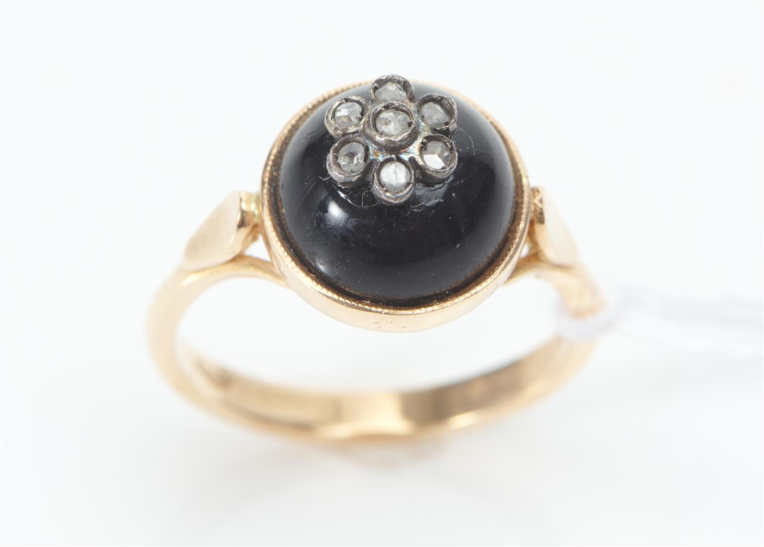 AN ANTIQUE STYLE DOMED RING IN 14CT GOLD FEATURING ROSE CUT DIAMONDS ON A ROUND ONYX CUT EN CABOCHON, SIZE L, 3.8GMS