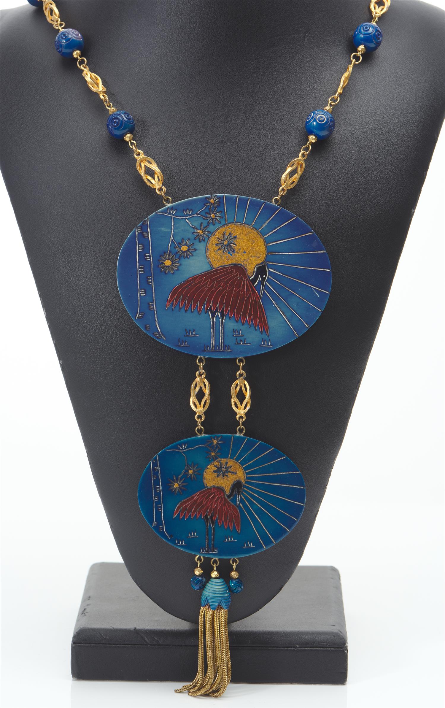 A VINTAGE NECKLACE WITH LARGE HAND PAINTED PLAQUES AND TASSELS IN THE JAPANESE STYLE