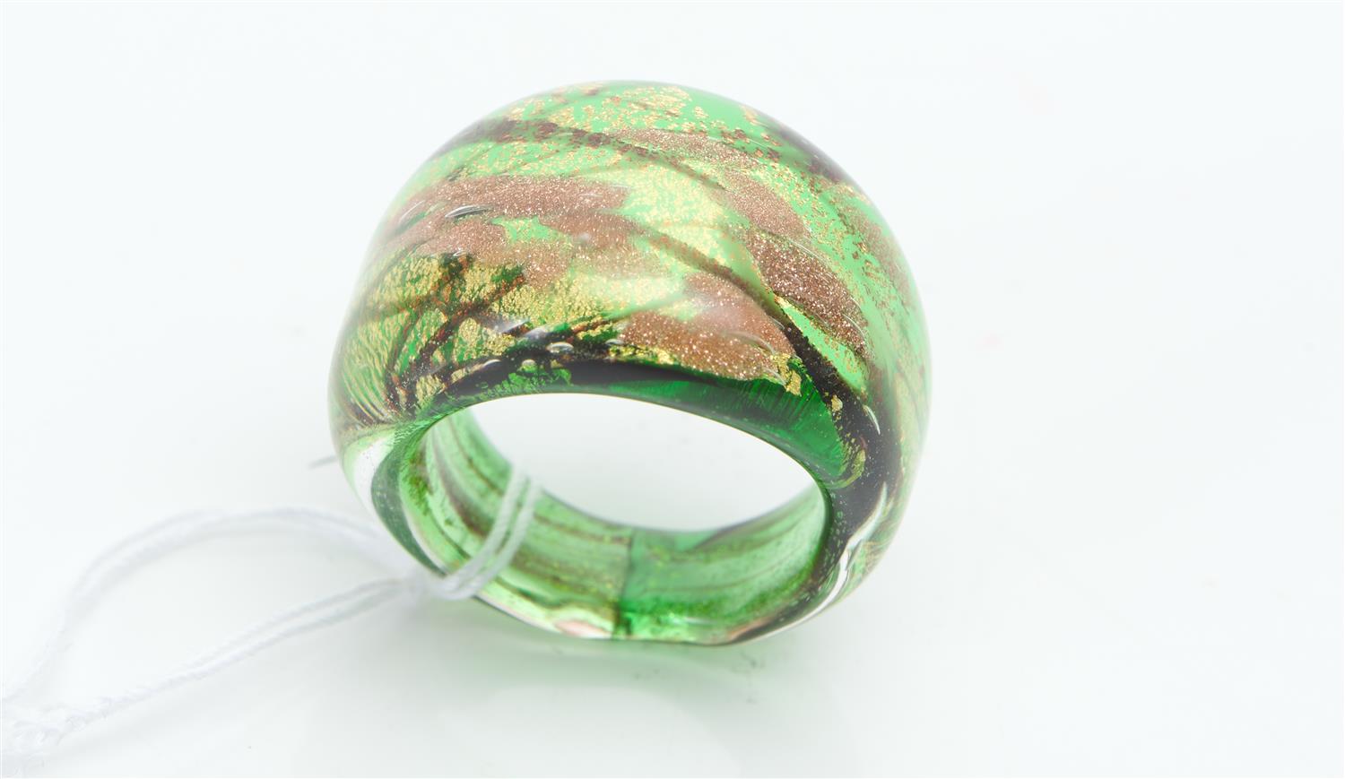 A WIDE MURANO GREEN GLASS RING, SIZE P-Q