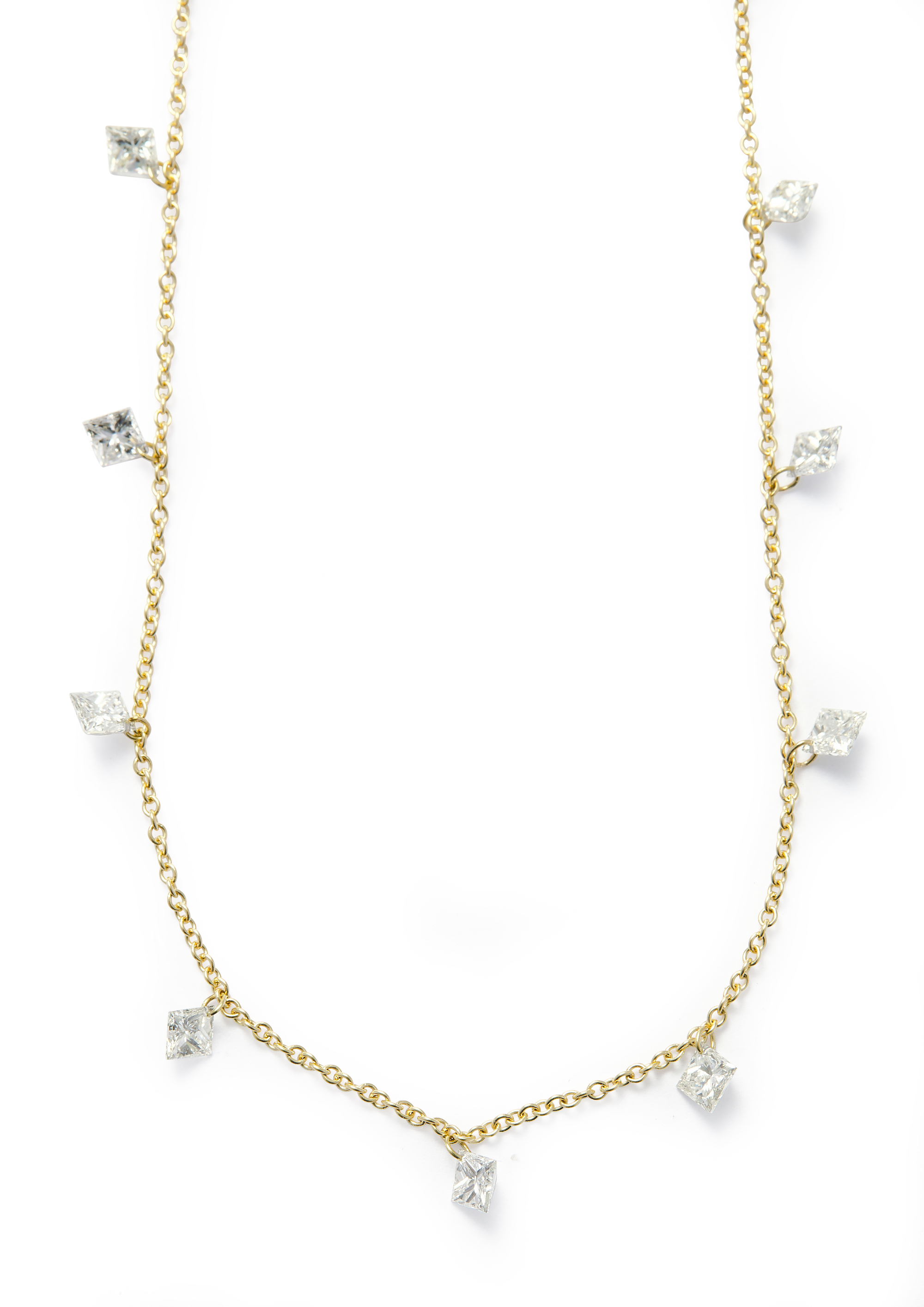 Designed as a fine trace chain suspending at intervals 13 princess-cut diamonds together weighing approximately 1.95 carats, circumference approximately 215mm, lobster clasp, adjustable.