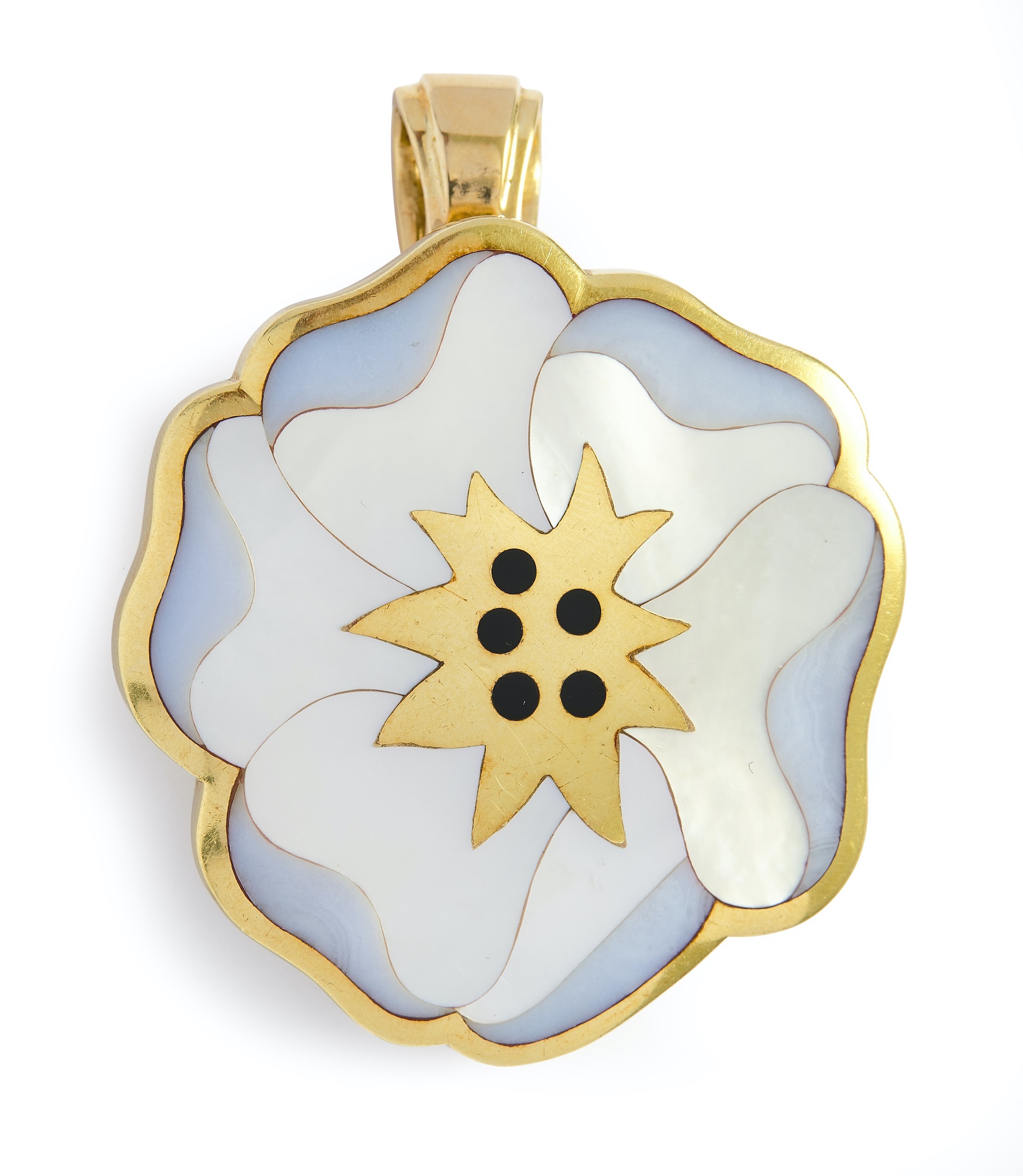18CT GOLD, MOTHER-OF-PEARL, BLACK JADE AND CHALCEDONY BROOCH/PENDANT AND EARCLIPS, ANGELA CUMMINGS FOR TIFFANY & CO.