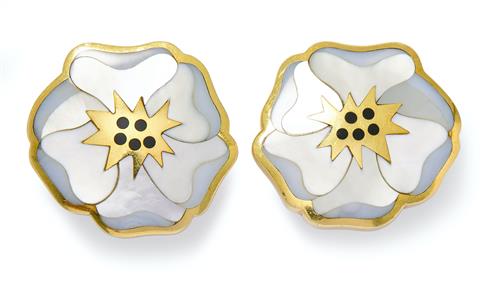 Comprising: a brooch of stylized floral design, inlaid with mother-of-pearl, grey chalcedony and black jade, diameter approximately 45mm; a pair of earrings en suite, approximately 30mm x 35mm, signed Tiffany & Co., post and clip fittings. (2)