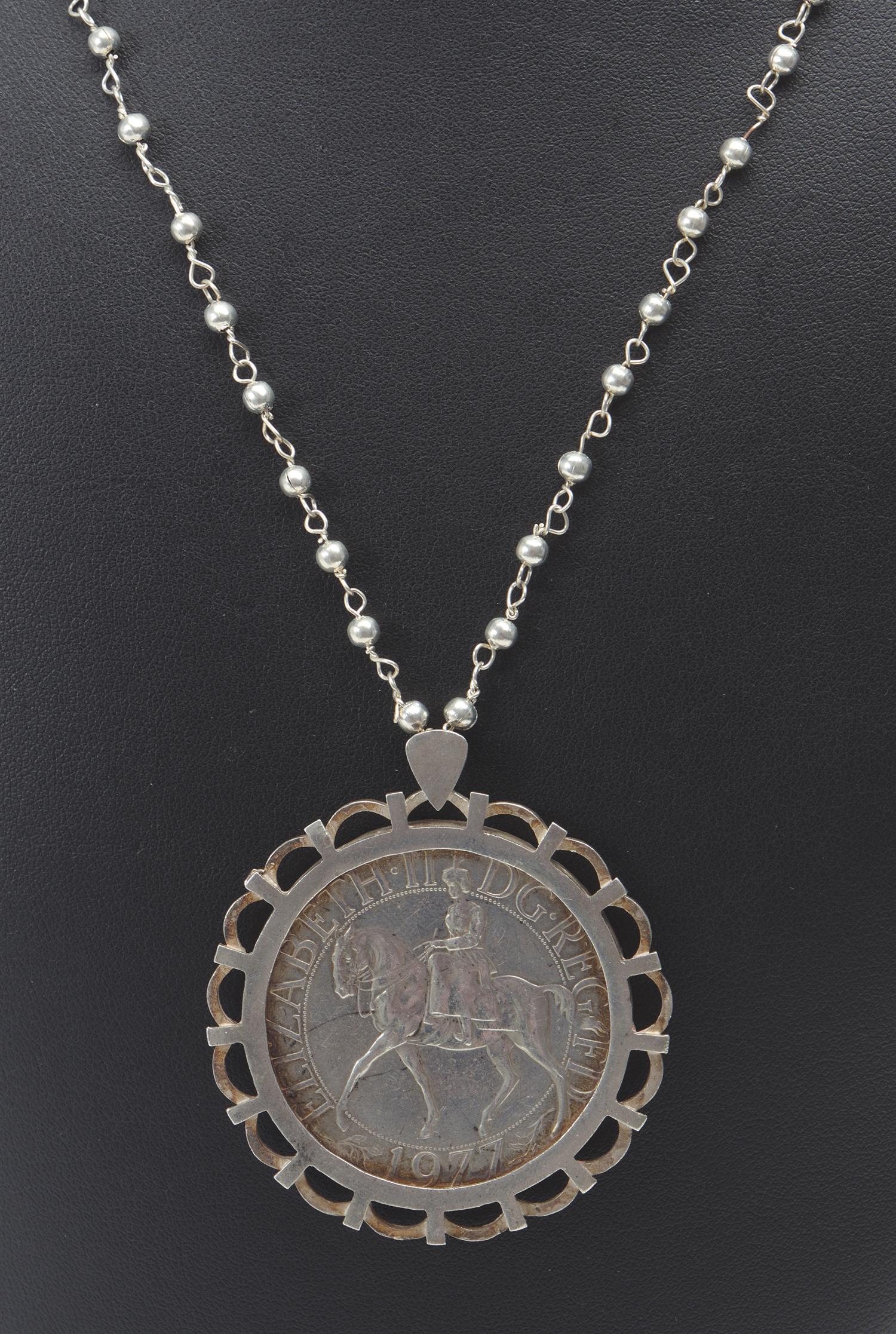 A QUEEN ELIZABETH II SILVER 25 PENCE COIN/PENDANT, DATED 1977, TO A FANCY LINK CHAIN IN SILVER, LENGTH OF THE PENDANT 55MM, TOTAL WEIGHT 47.8GMS