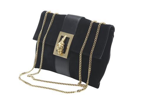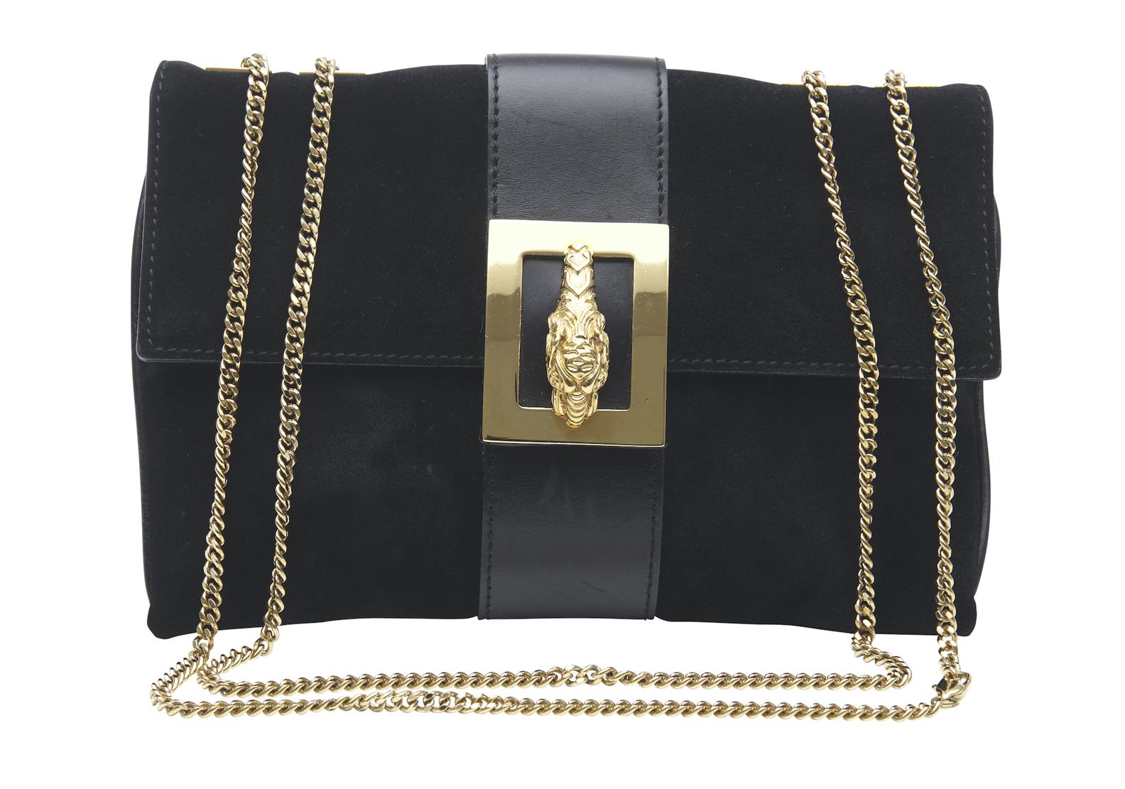 AN EVENING BAG BY GUCCI-Styled in black suede and leather with gold metal hardware featuring a tiger head clasp and chain shoulder strap, 22 x 15cm.