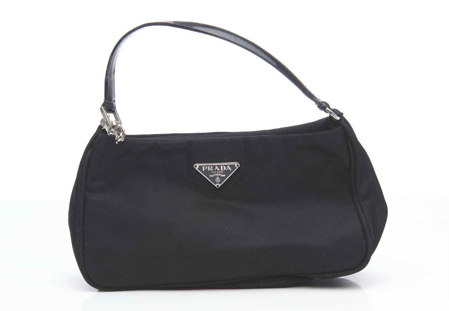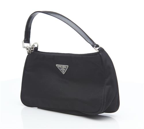 Styled in black nylon with silver metal hardware and confirming patent leather shoulder strap, 18 x 10 x 7cm.