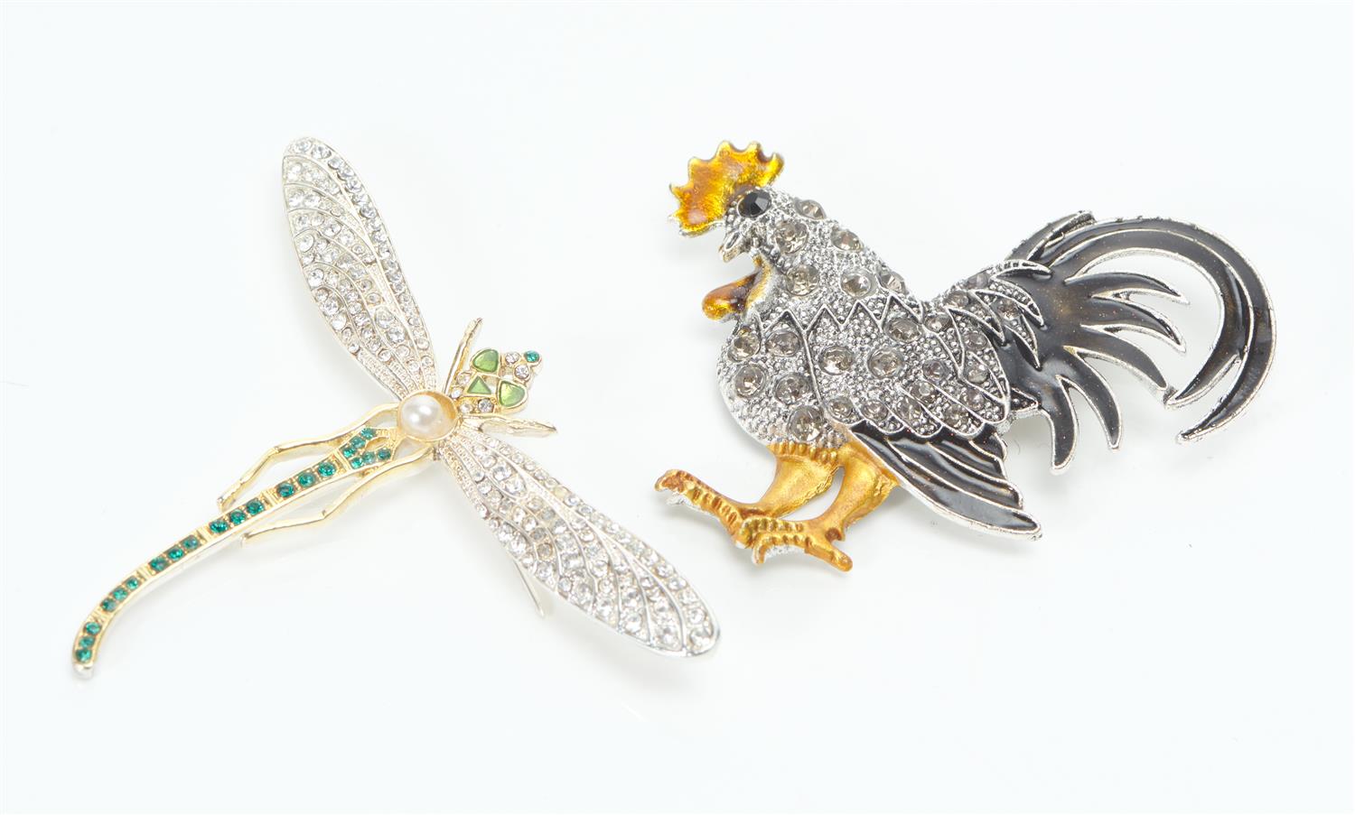 A PASTE DRAGONFLY BROOCH IN GILT, REPRODUCTION OF RUSSIAN PIECE FROM MOSCOW KREMLIN MUSEUM, RETAILED BY MOMA NY, 55X75MM, BOXED, TOGETHER WITH A ROOSTER BROOCH