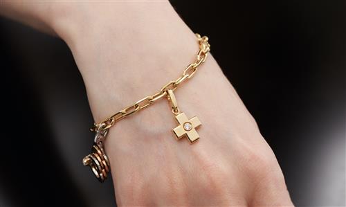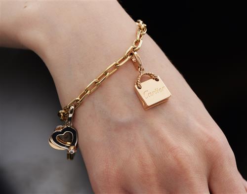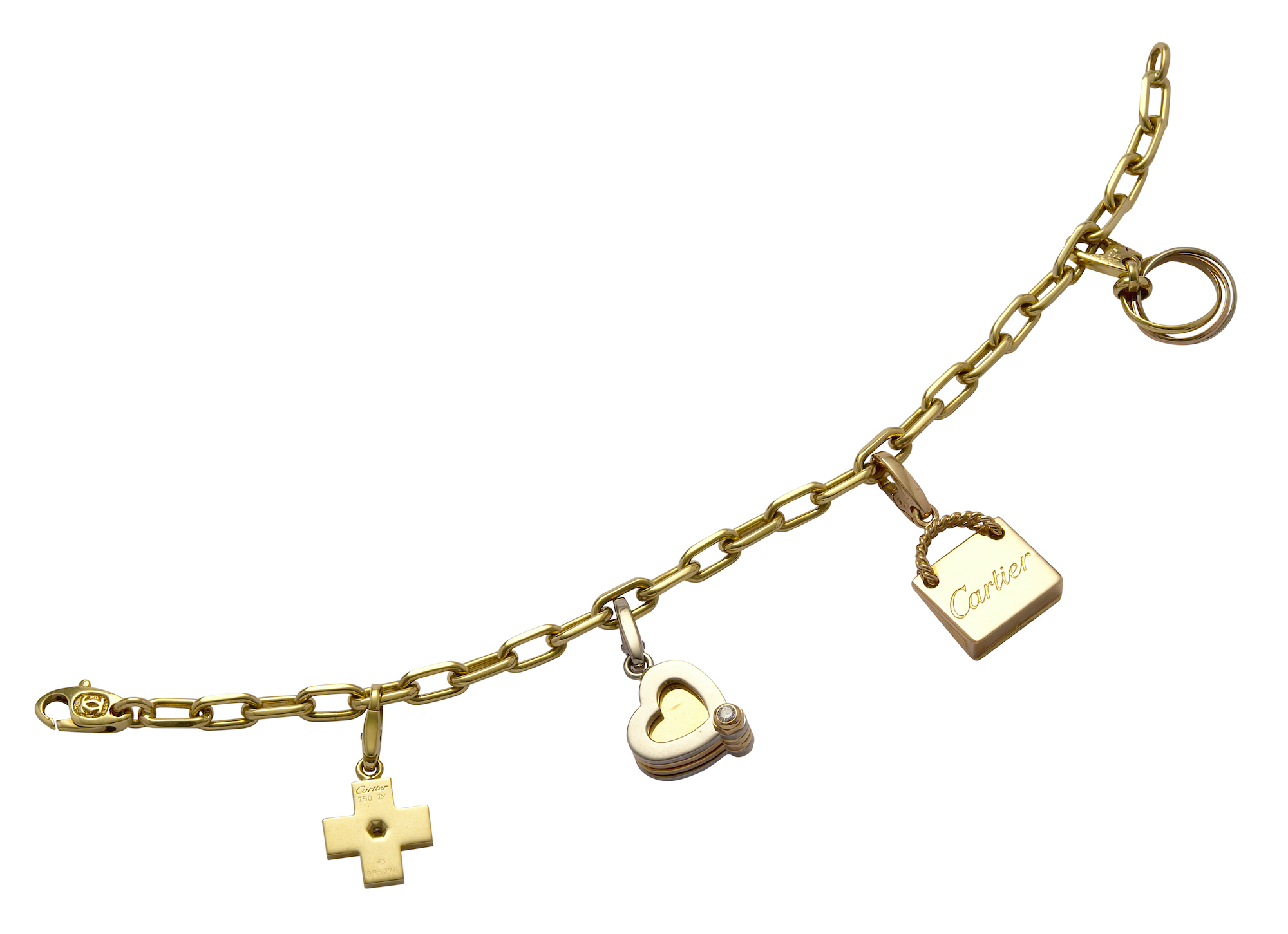 Composed of a line of rectangular links suspending four detachable charms including a swiss cross with collet-set brilliant-cut diamond, heart clover with similarly set diamond, Cartier tote bag and Trinity ring, completed by a lobster clasp, length approximately 180mm, bracelet signed Cartier, numbered AB2984, the charms signed Cartier and numbered BR5276, NA6677, DF5970 and 773737 respectively.