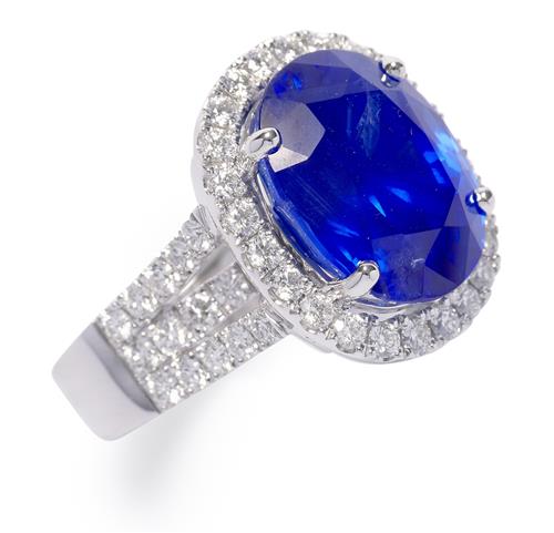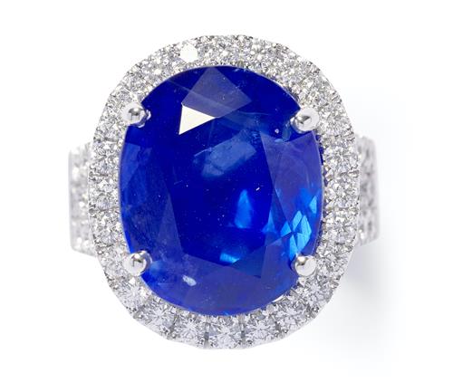 Of cluster design, centring a claw-set oval Burmese blue sapphire weighing 14.32 carats, framed by brilliant-cut diamonds, supported by similarly set split shoulders, size L.