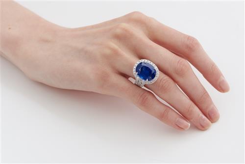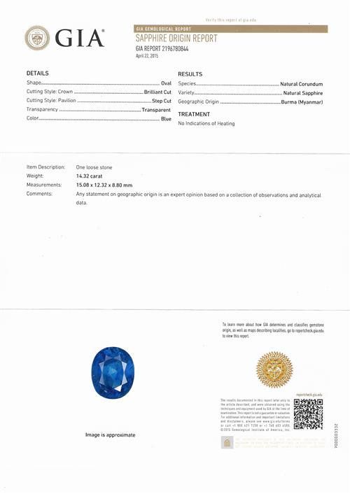 Accompanied by a GIA report numbered 2196780844, dated 22 April 2015, stating that the 14.32 carat sapphire is natural, with no indications of heating, of Burmese (Myanmar) origin.