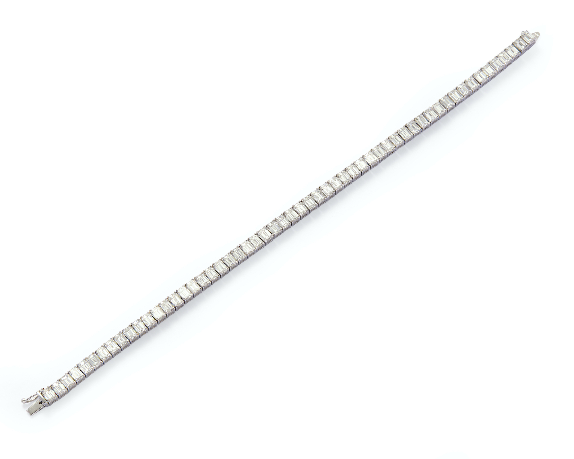 Composed of a line of 56 collet-set emerald-cut diamonds completed by a concealed box clasp, the diamonds together weighing approximately 11.52 carats, length approximately 180mm.
