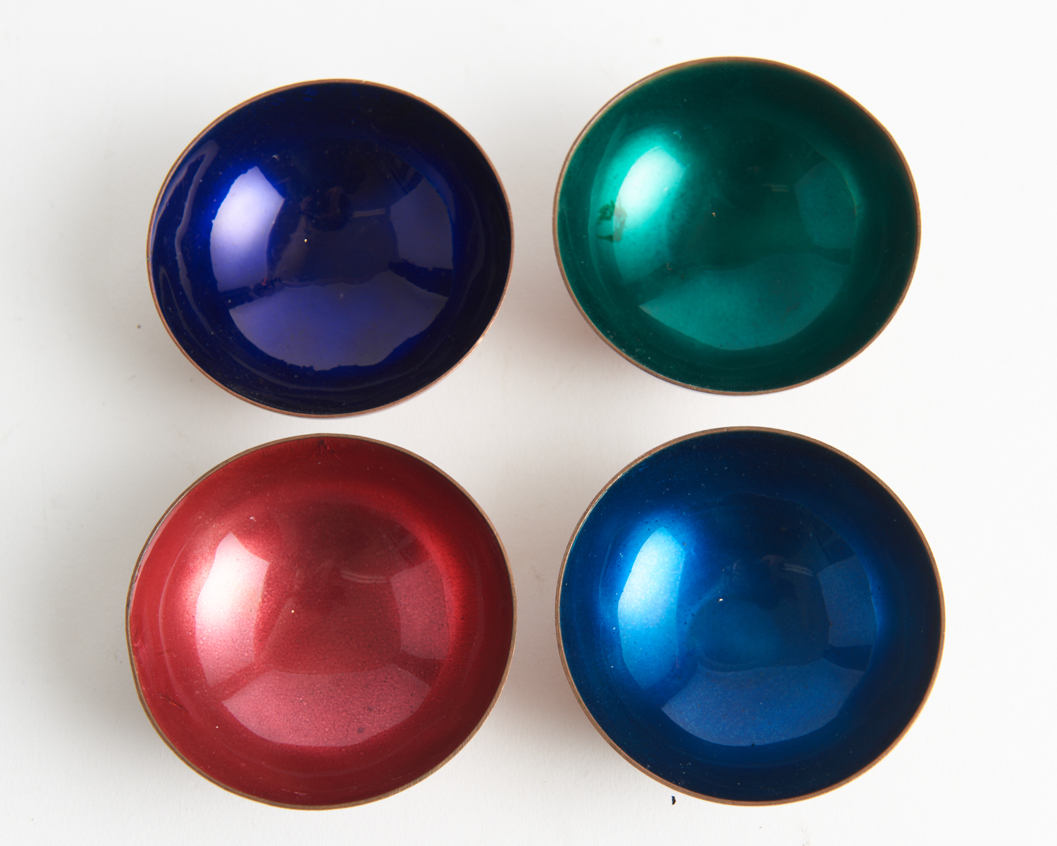 FOUR SMALL BRASS AND ENAMEL BOWLS (7.5 CM DIAMETER), LEONARD JOEL LOCAL DELIVERY SIZE: SMALL