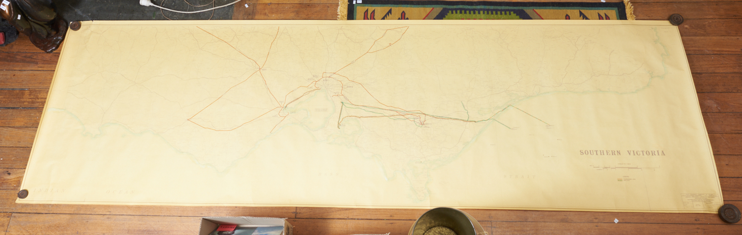 A 1969 STATE ELECTRICITY COMMISSION MAP OF SOTHERN VICTORIA SHOWING MAJOR TRANSMISSION LINES AND GAS AND OIL PIPELINES, SCALE: 4 MILES TO 1 INCH (350 X 103 CM), LEONARD JOEL LOCAL DELIVERY SIZE: SMALL