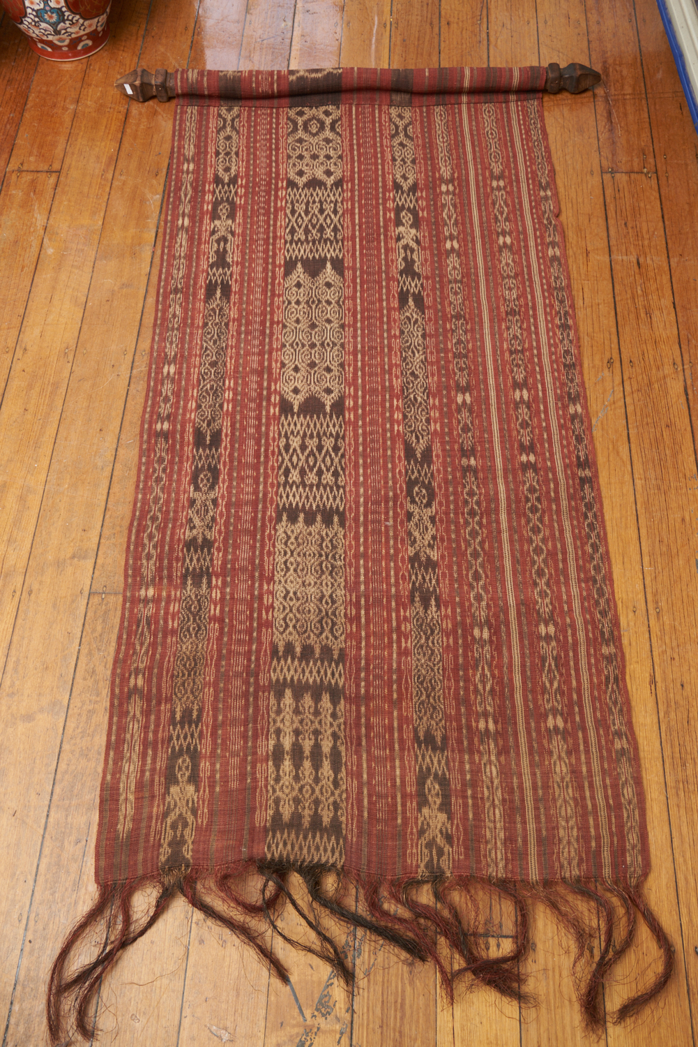 AN INDONESIAN HAND WOVEN FIBRE WALL HANGING WITH A HAND CARVED WOODEN ROD (180 X 76 CM), LEONARD JOEL LOCAL DELIVERY SIZE: SMALL