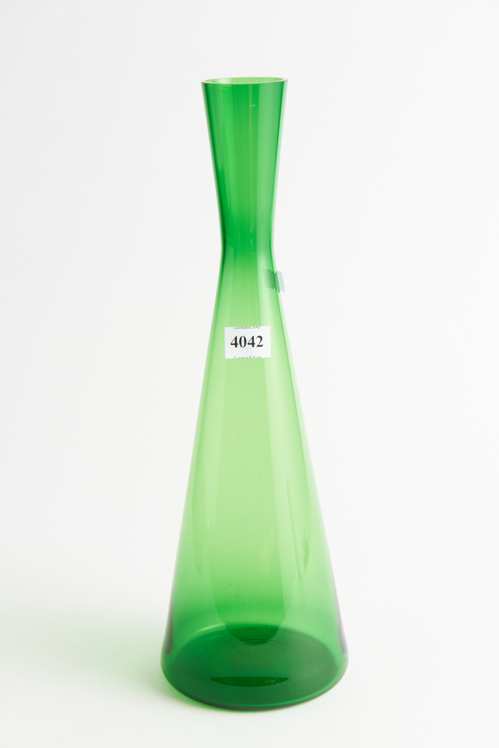 A 1950S HOLMGAARD GREEN GLASS CARAFE BY PER LUTKIN (35 CM HIGH), LEONARD JOEL LOCAL DELIVERY SIZE: SMALL