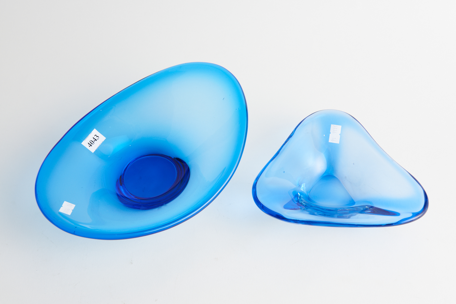 TWO HAND BLOWN BLUE GLASS MID-CENTURY BOWLS (20 X 26 CM LARGEST), LEONARD JOEL LOCAL DELIVERY SIZE: SMALL