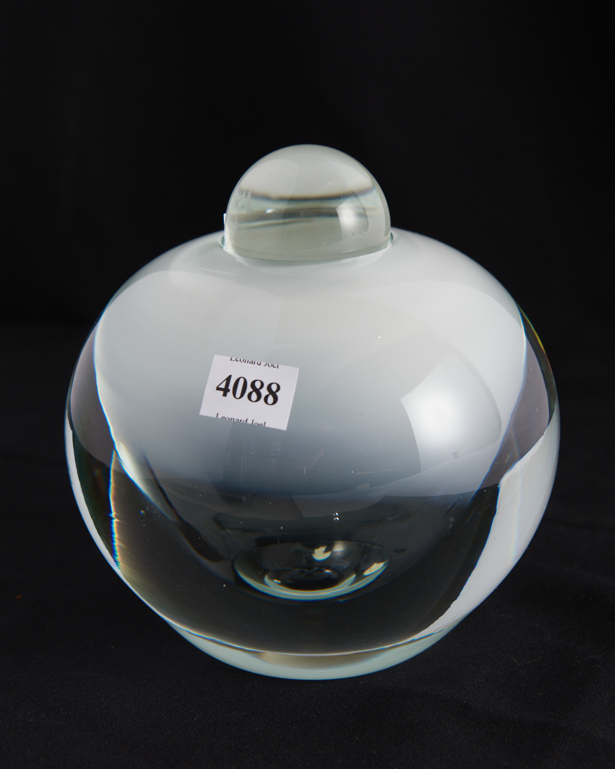 A VERY HEAVY ART DECO STYLE MOUTH-BLOWN GLASS BOWL WITH A SPHERICAL STOPPER (16 CM HIGH), LEONARD JOEL LOCAL DELIVERY SIZE: SMALL