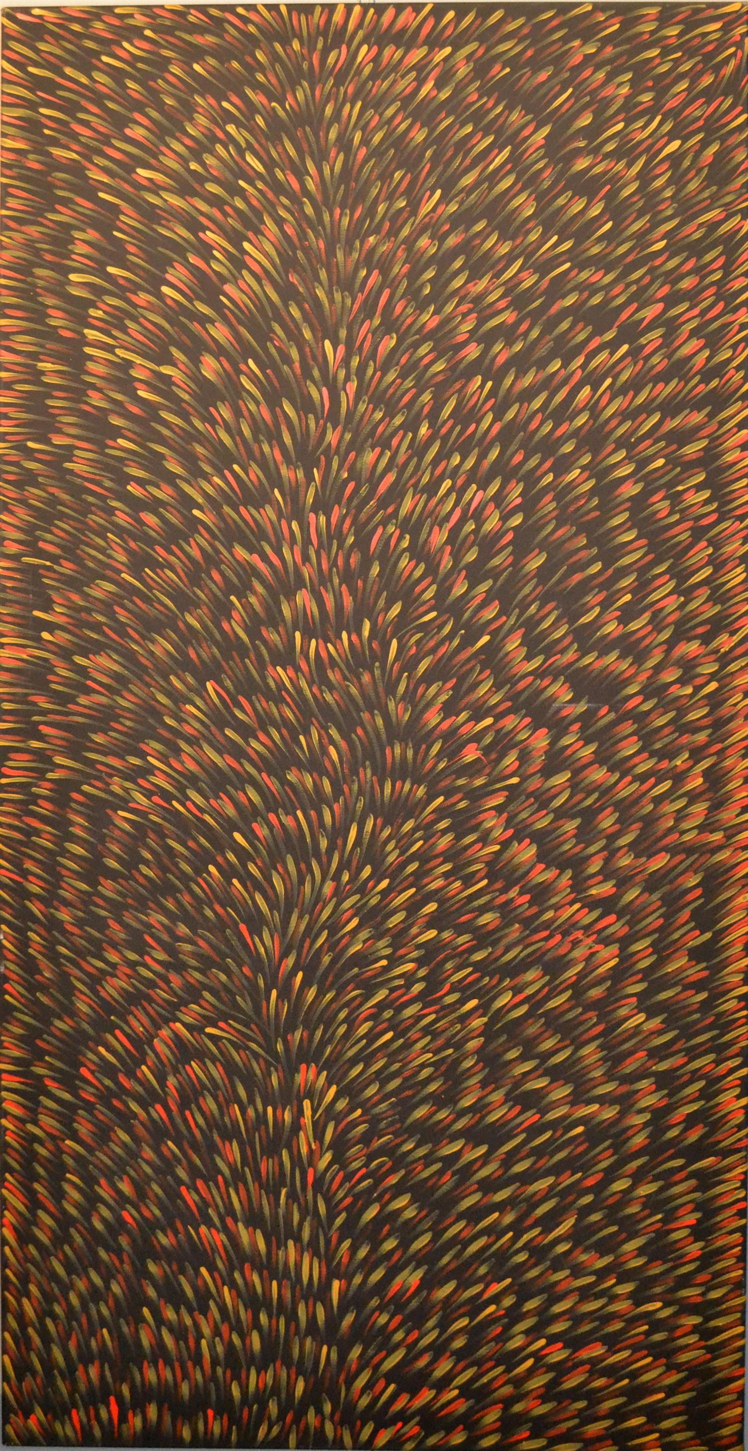 GLORIA PETYARRE, BUSH MEDICINE DREAMING 2005, ACRYLIC ON CANVAS, INSCRIBED VERSO WITH ARTIST'S NAME, DATE, AND TITLE, 157 X 81.5CM, [accompanied by a copy of the certificate from The Artery Contemporary Aboriginal Art which also shows a photo of the artist with the completed painting] STRETCHED WITH NO ADDITIONAL FRAMING, LEONARD JOEL DELIVERY SIZE: LARGE