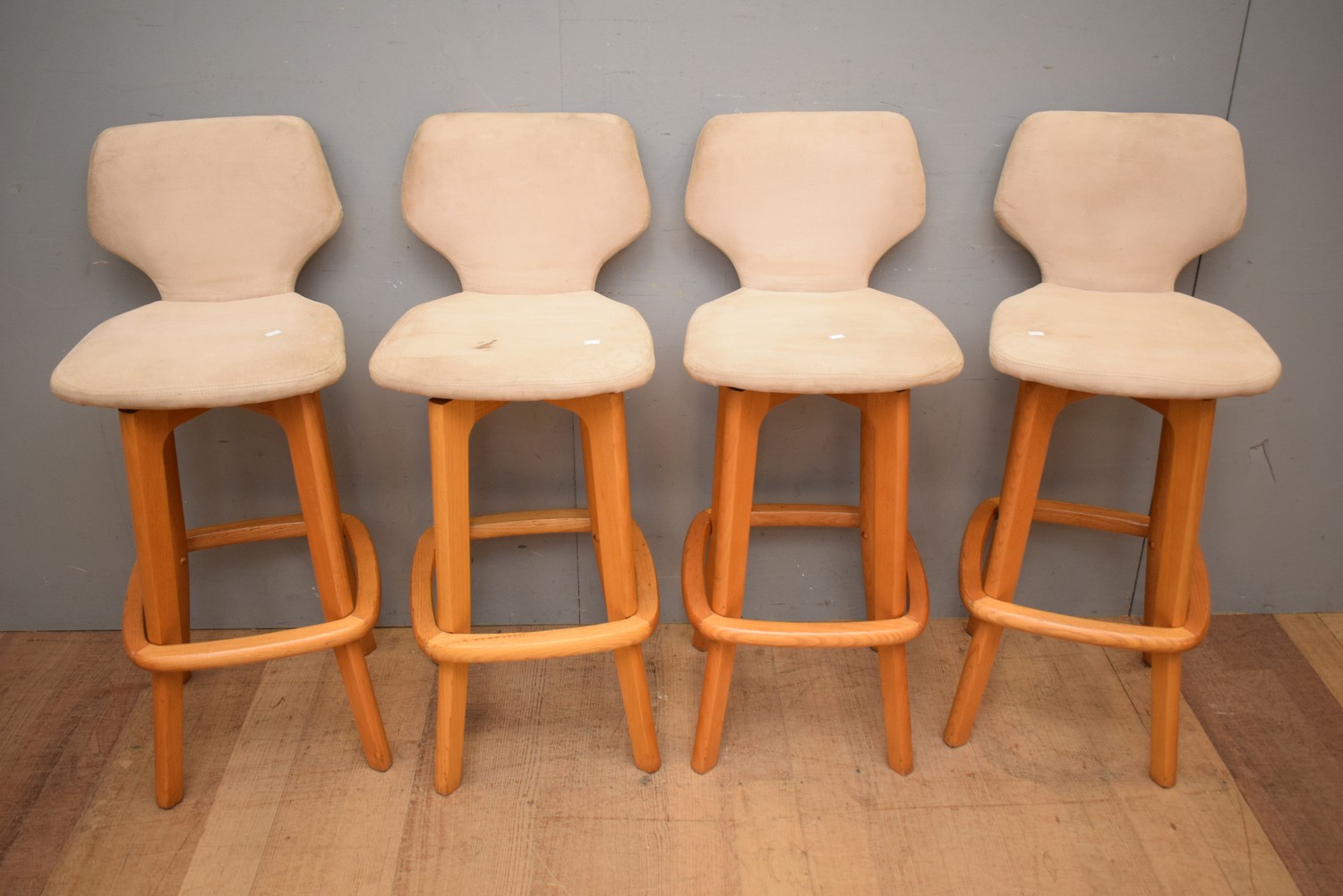 A SET OF FOUR SUEDE UPHOLSTERED BARSTOOLS (A/F) (104H x 40W x 40D CM) (LEONARD JOEL DELIVERY SIZE: MEDIUM)