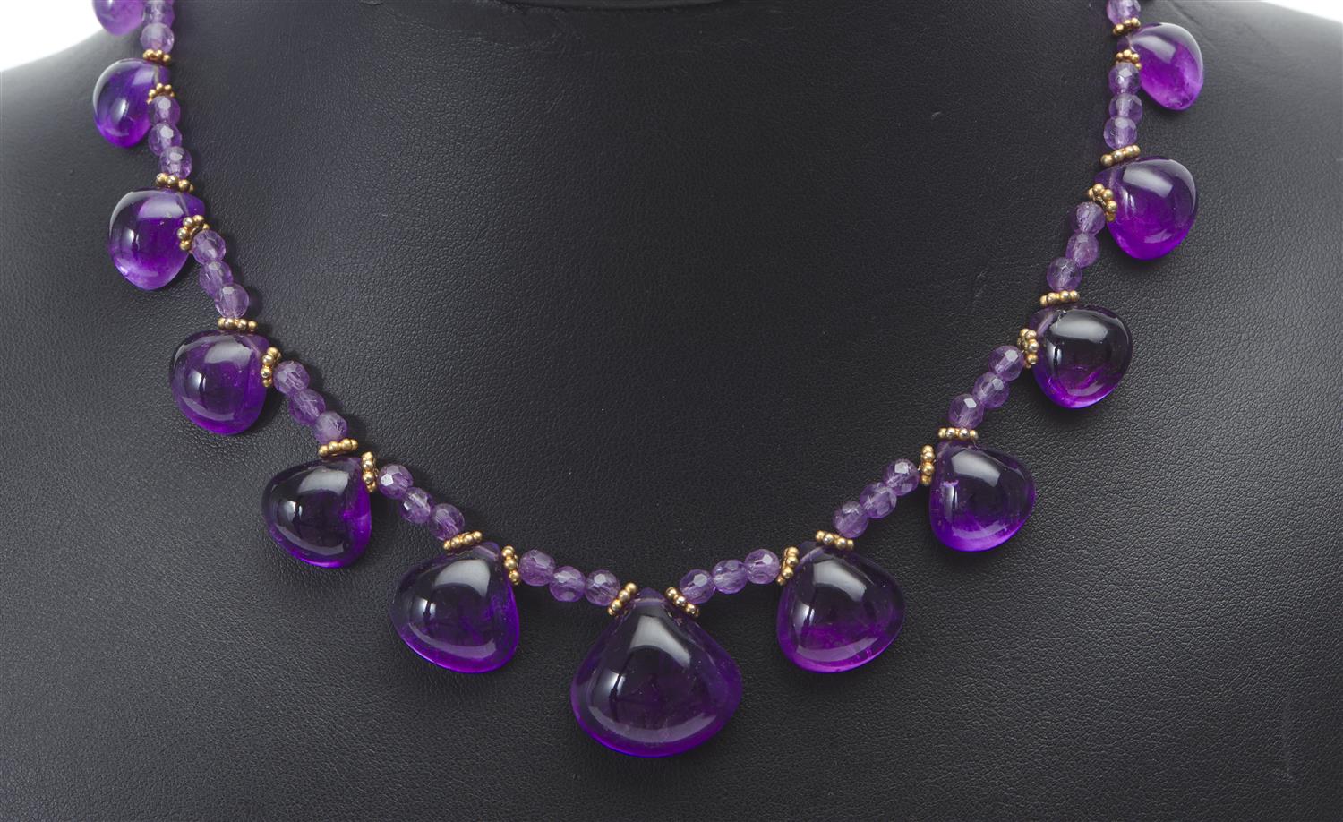 AN AMETHYST NECKLACE COMPRISING DROP SHAPED GRADUATING AMETHYSTS, SPACED BY FACETED AMETHYST BEADS, TO A T-BAR FITTING WITH DIAMOND TERMINALS, IN 9CT GOLD, TOTAL LENGTH 410MM