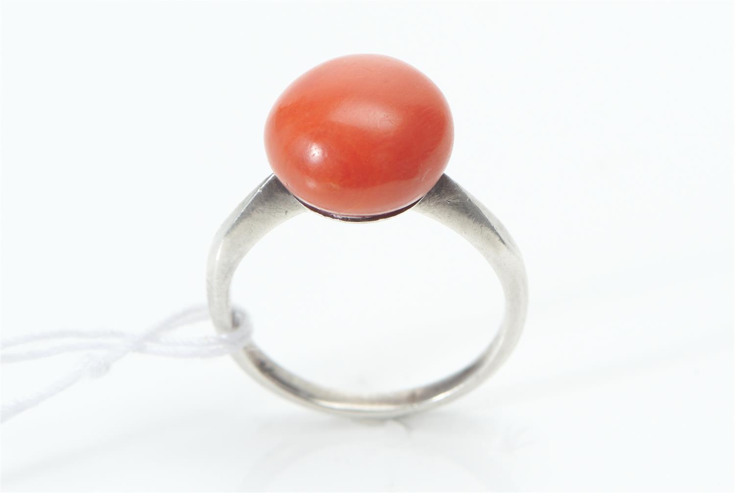 A BUTTON SHAPED CORAL RING IN STERLING SILVER, SIZE M