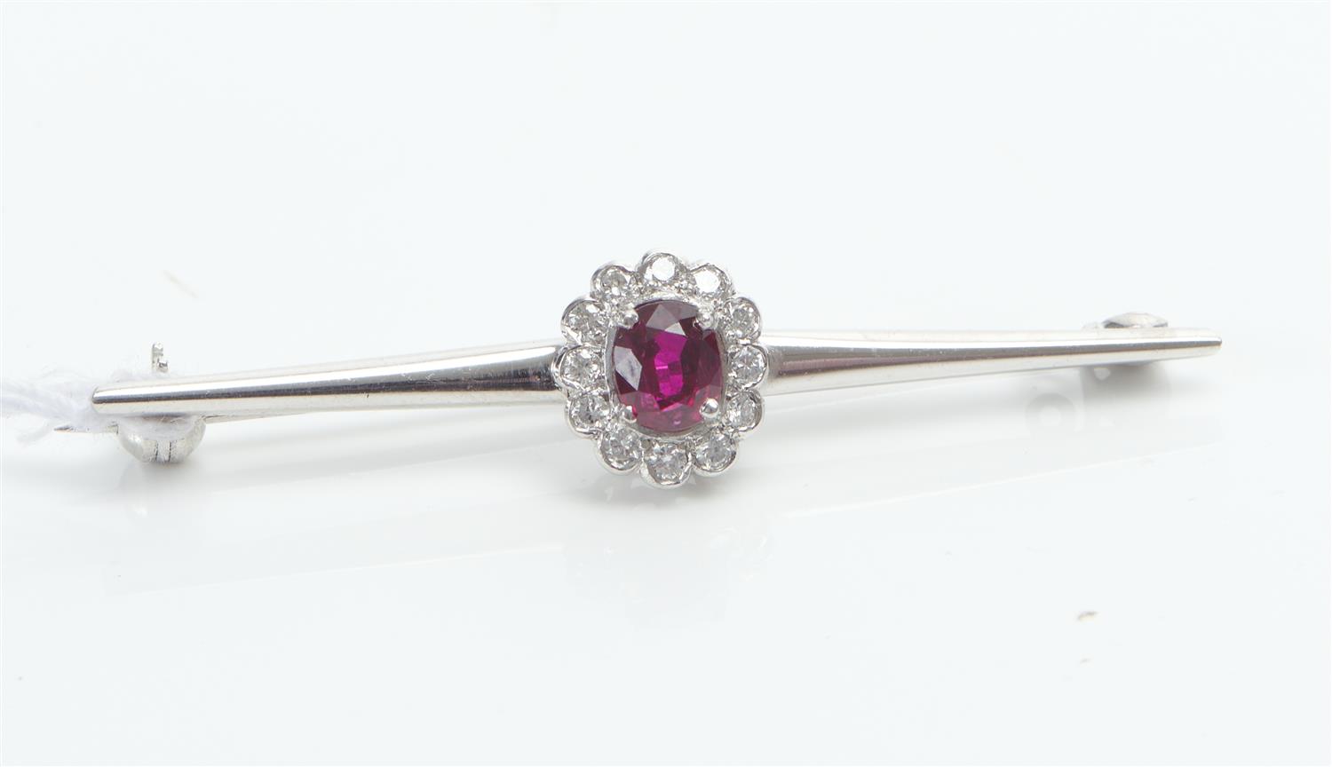 A TREATED RUBY AND DIAMOND BAR BROOCH, THE RUBY WEIGHING APPROXIMATELY 0.75CTS, IN 18CT WHITE GOLD, 5.16 GRAMS, LENGTH 50MM