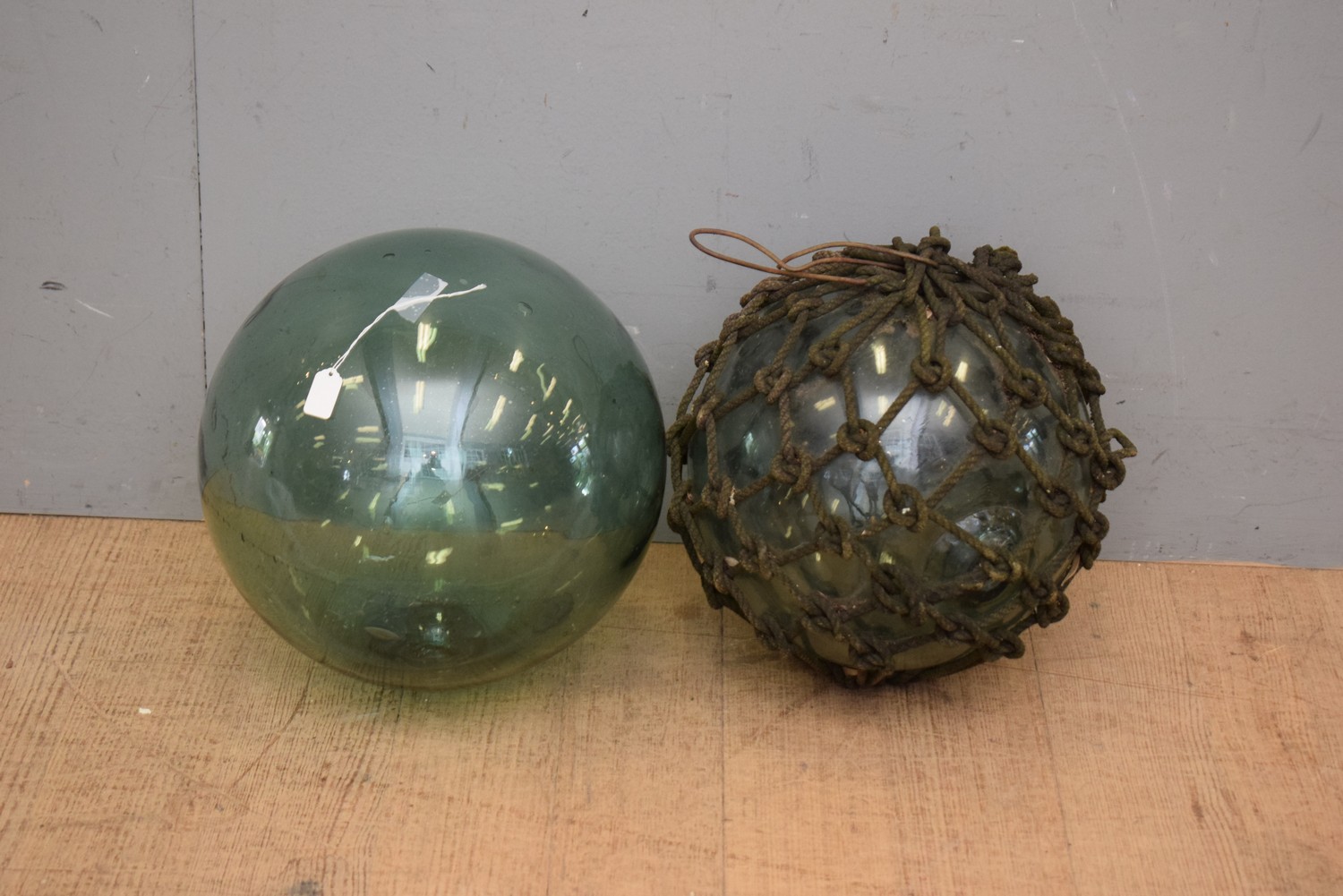 TWO GREEN GLASS FISHING BUOYS (35H X 26W CM) (LEONARD JOEL DELIVERY SIZE: SMALL)