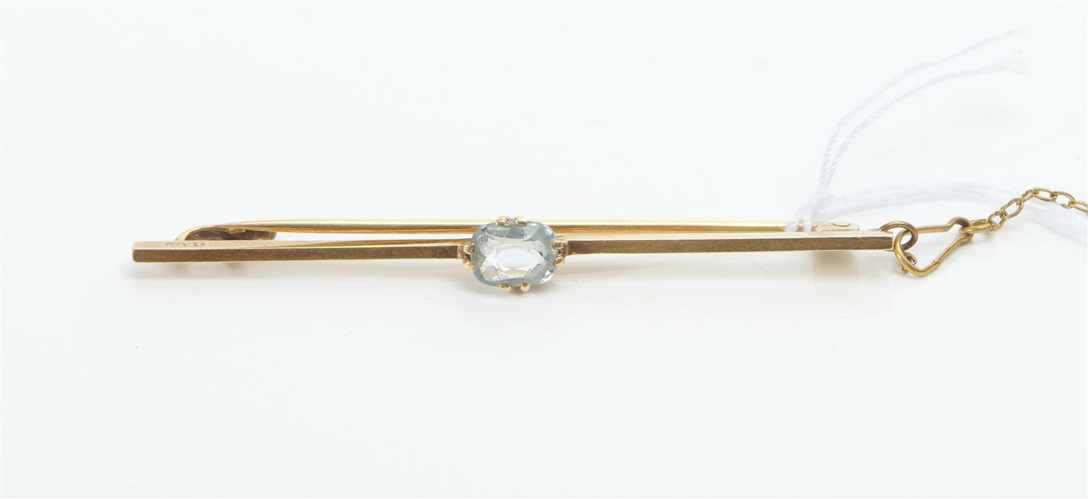 A VINTAGE AQUAMARINE BROOCH IN 15CT GOLD, LENGTH 59MM, 3.6GMS
