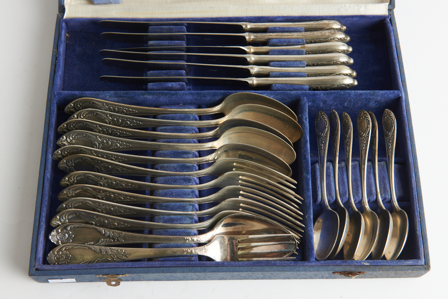 A SOVIET RUSSIAN 875 SILVER PART FLATWARE SERVICE, TOGETHER WITH TWO SOVIET RUSSIAN KOLCHUG-MIZAR SILVER PLATE REPLACEMENT PIECES, LEONARD JOEL LOCAL DELIVERY SIZE: SMALL
