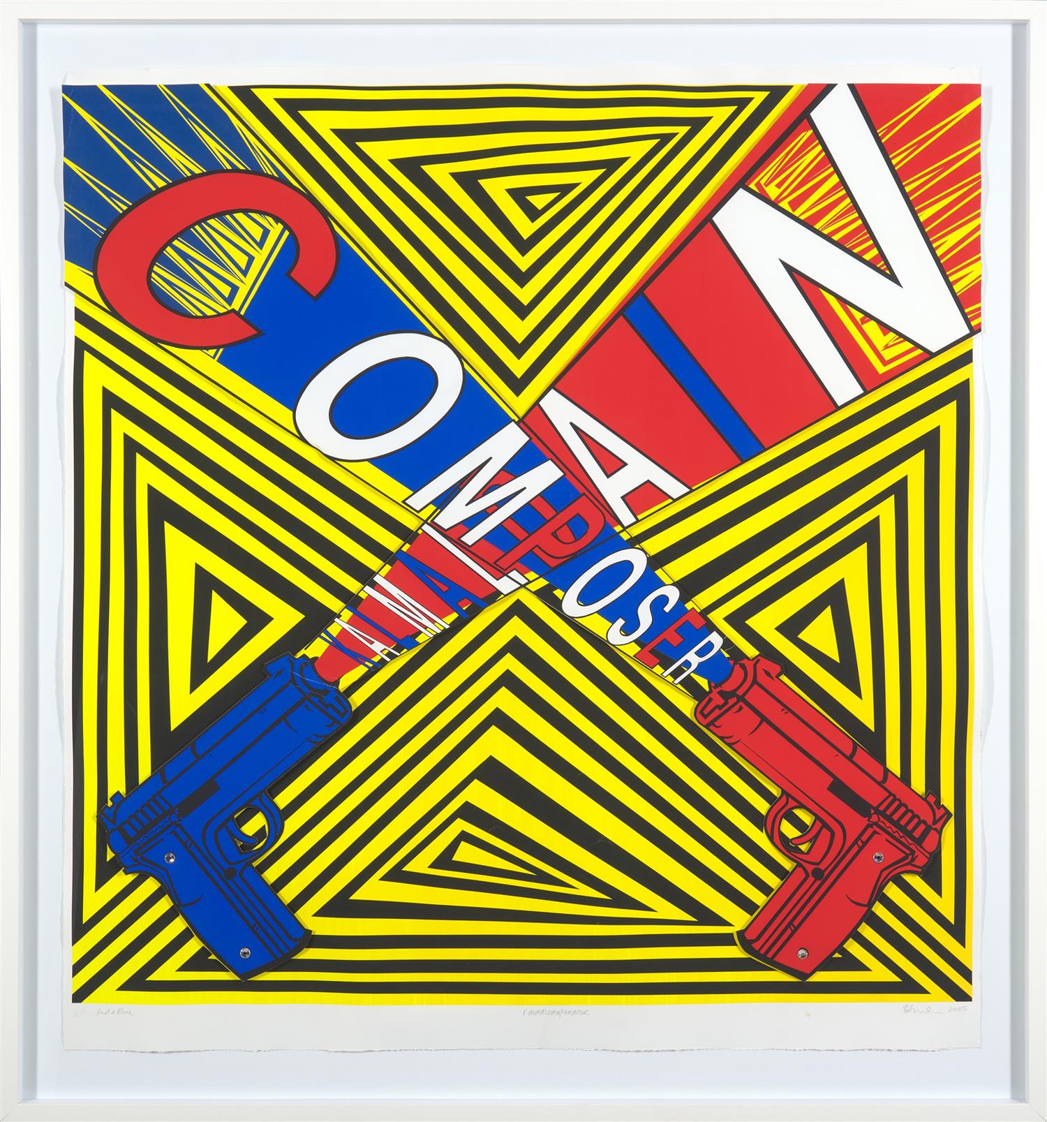 There are creases across the lower centre of the work, in the paper, not the collage. There are noticable creases at the tip of the red gun and there are notable creases to the right corner of the collage and a small tear to the upper right hand corner of the artwork approx. 5mm.