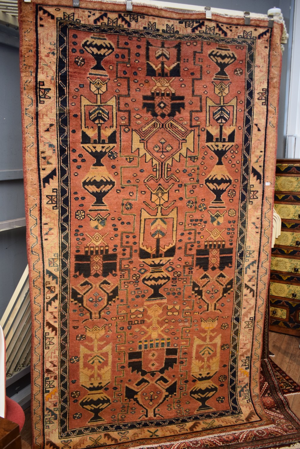 A RARE CIRCA 1960s TRIBAL PERSIAN LURI RUG. 100% WOOL. NATURAL DYES. VINTAGE PILE. HAND-KNOTTED TRIBAL WEAVE WITH RARE DESIGN OF URNS BEARING STYLIZED FLORAL FOLIAGE SET AGAINST GEOMETRIC PATTERNS. FULLY RESTORED. GALLERY INVENTORY. CERTIFICATE OF AUTHENTICITY INCLUDED. SIZE: 265X150CM ORIGIN: PERSIA - RRP: $2,700