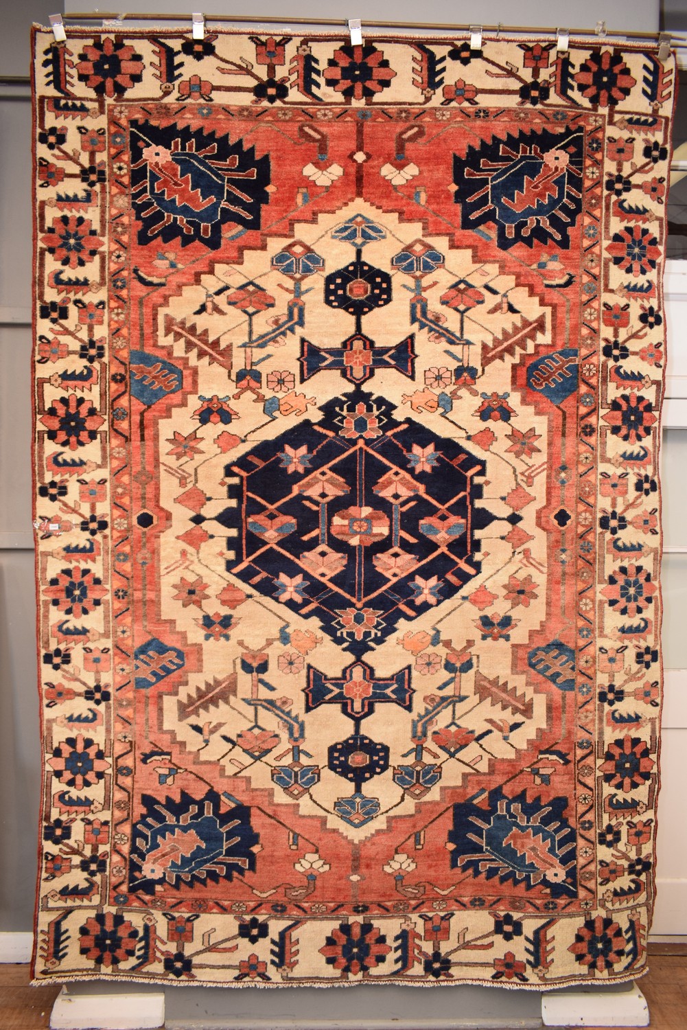 A RARE TRIBAL PERSIAN BAKHTIAR RUG. 100% WOOL. VINTAGE PILE. NATURAL DYES. HAND-KNOTTED TRIBAL WEAVE WITH RARE DESIGN OF BOLD GEOMETRIC MEDALLION & CORNER MEDALLIONS CONTAINING BOLD PALMETTES IN A CREAM FIELD OF GEOMETRIC PATTERNS & LEAF FORMS. GALLERY INVENTORY. FULLY RESTORED & IN EXCELLENT CONDITION. CERTIFICATE OF AUTHENTICITY INCLUDED. SIZE: 300X205CM ORIGIN: PERSIA - RRP: $3,300