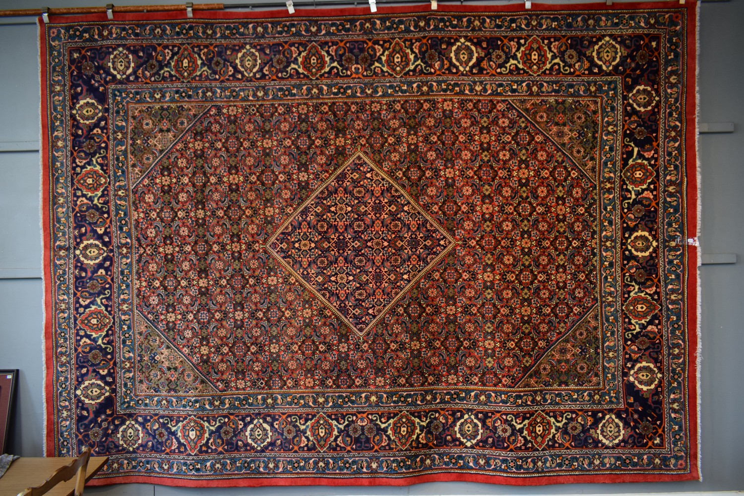 A MAGNIFICENT LARGE PERSIAN SAROUQ MAHALLAT CARPET. 100% FINE WOOL PILE. SOLID & HARD-WEARING. FINELY HAND-KNOTTED CITY WEAVE WITH RARE DESIGN OF DIAMOND-SHAPED MEDALLION & CORNER MEDALLIONS IN A FIELD OF ALL-OVER HERATI MAHI PATTERNS. WIDE BORDER OF PALMETTES, ROSETTES & TENDRLS. MINOR BORDERS OF PALMETTES & TENDRILS. EX-GALLERY EXHIBITED. IN PRISTINE CONDITION. CERTIFICATE OF AUTHENTICITY INCLUDED. SIZE: 400X293CM ORIGIN: PERSIA - RRP: $9,500