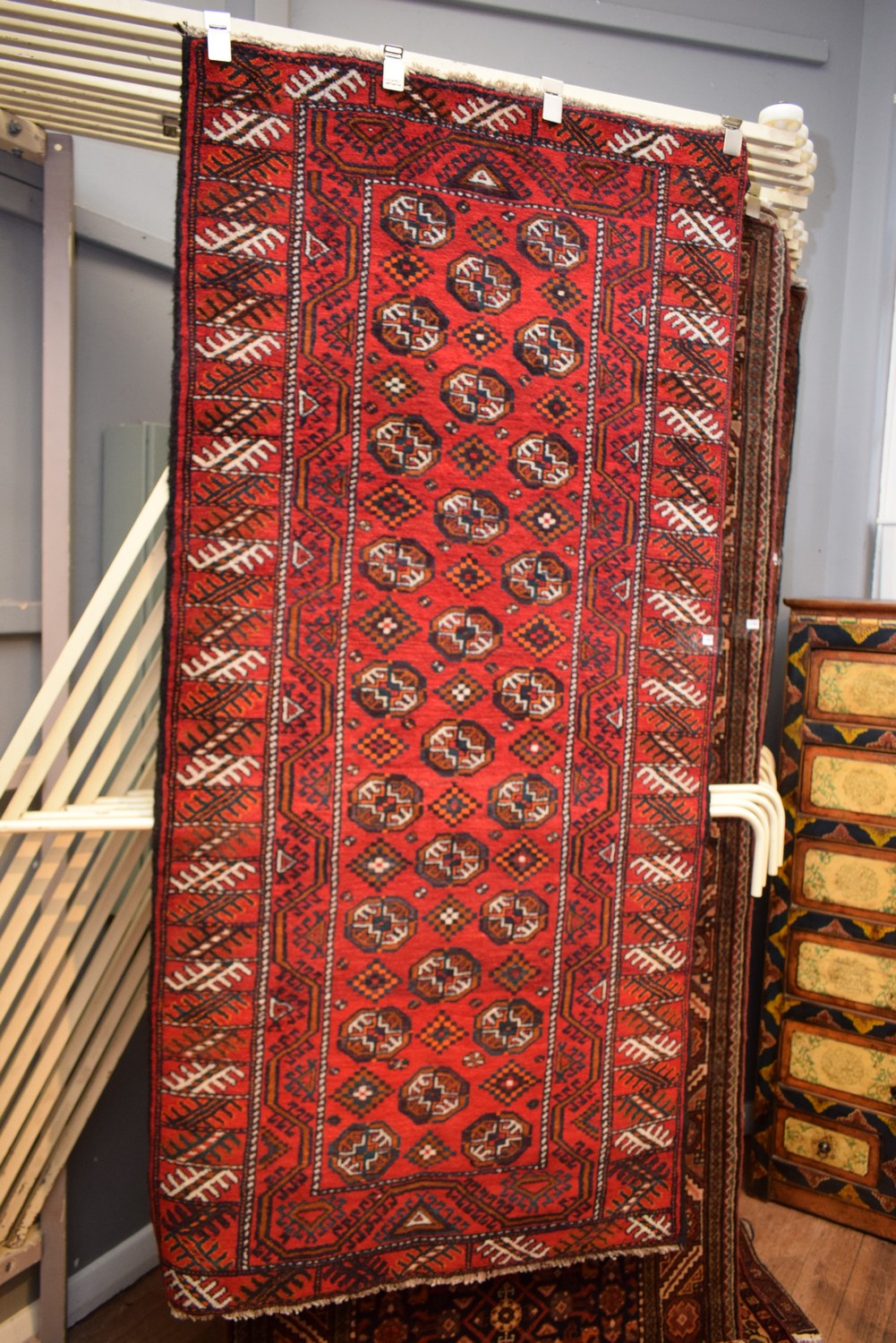 A TRIBAL PERSIAN TURKOMAN RUG. 100% WOOL. FINELY HAND-KNOTTED TRIBAL WEAVE & DESIGN OF ALL-OVER TRIBAL TURKOMAN GUL MOTIFS. GEOMETRIC-PATTERNED BORDER. GALLERY INVENTORY. IN EXCELLENT CONDITION. CERTIFICATE OF AUTHENTICITY INCLUDED. SIZE: 205X103CM ORIGIN: PERSIA - RRP: $1,400