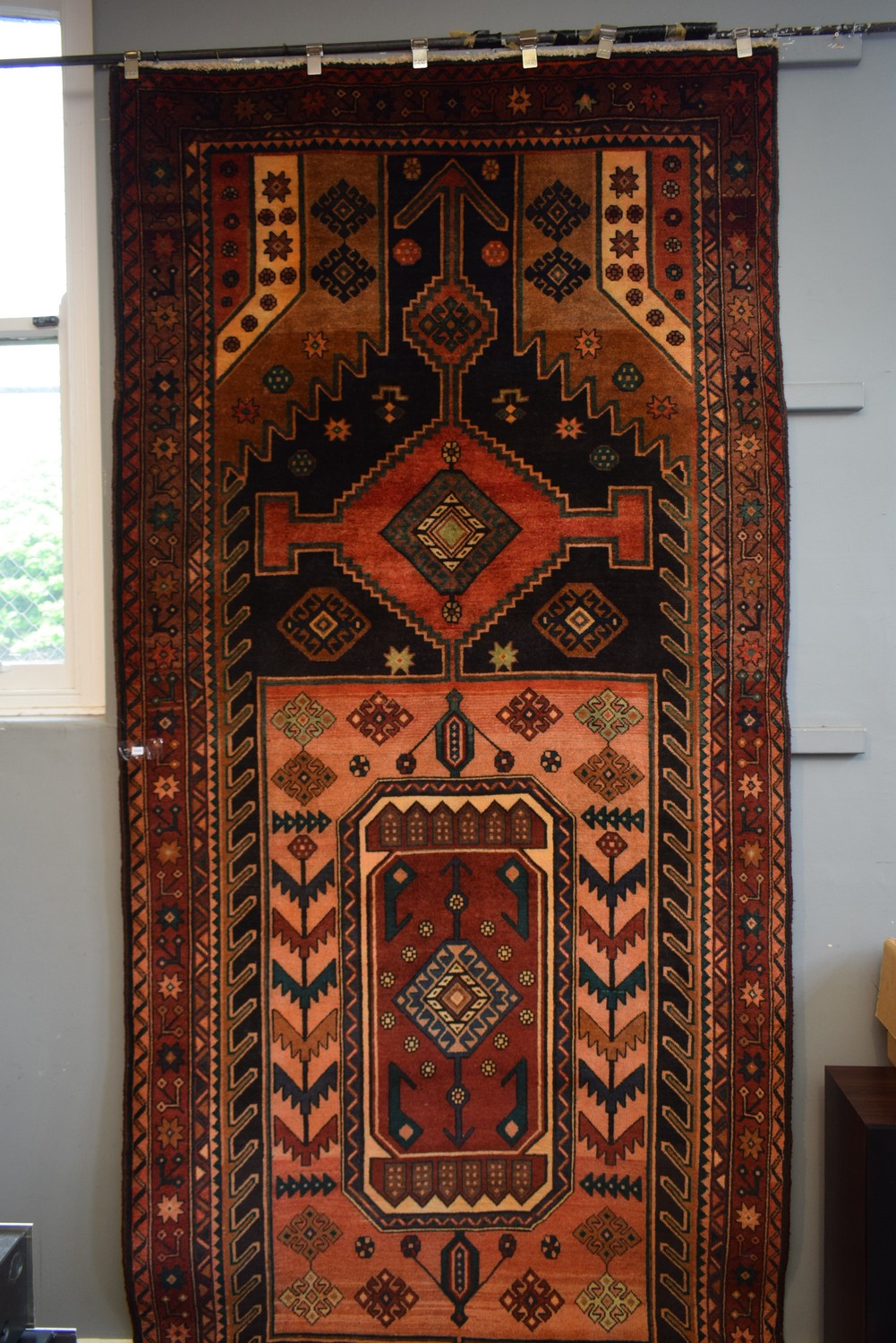 A RARE & COLLECTABLE CIRCA 1970s NOMADIC PERSIAN SHAHSAVAN RUG, 100% WOOL. NATURAL DYES. RARE LONG RUG. HAND-KNOTTED NOMADIC WEAVE WITH RARE DESIGN OF BOLD ANCHORED RECTANGULAR MEDALLION CONTAINING A MEDALLION & TREE OF LIFE PATTERNS IN A CHARCOAL-TONED FIELD OF FLORAL PATTERNS. BORDER OF FLORAL MOTIFS. GALLERY DISPLAYED. IN EXCELLENT CONDITION. CERTIFICATE OF AUTHENTICITY INCLUDED. SIZE: 451X160CM ORIGIN: PERSIA - RRP: $4,800