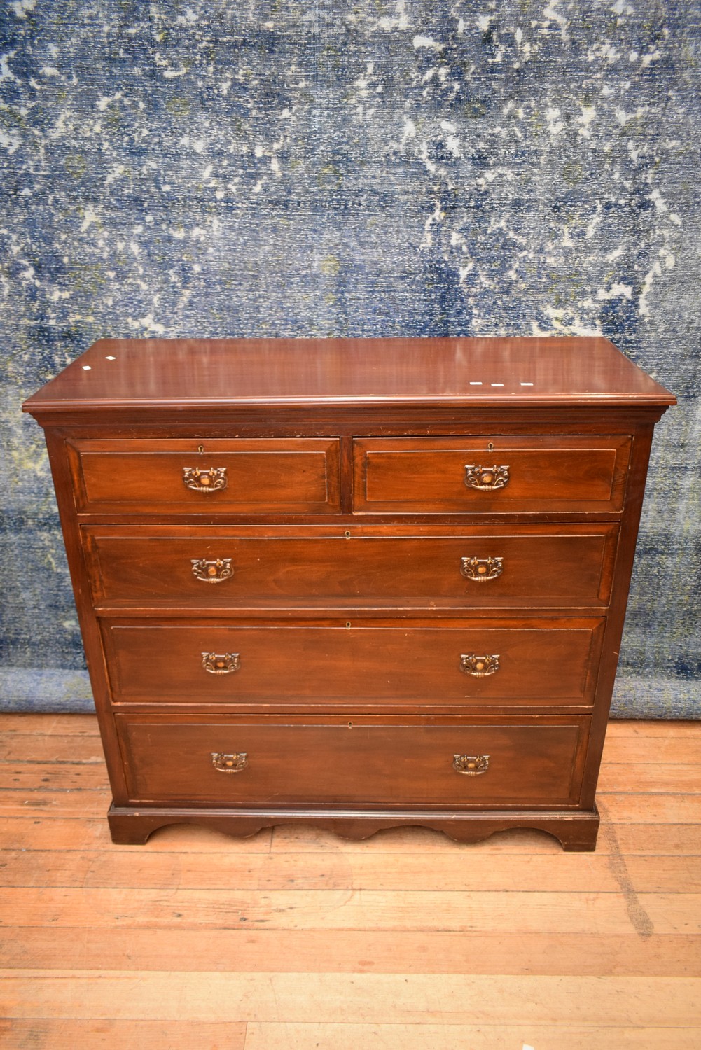A MAHOGANY FIVE DRAWER CHEST OF DRAWERS (116H x 122W x 48D CM) (PLEASE NOTE THIS HEAVY ITEM MUST BE REMOVED BY CARRIERS AT THE CUSTOMER'S EXPENSE. LEONARD JOEL STAFF CANNOT ASSIST CARRYING THIS ITEM) (X-LARGE ITEM)