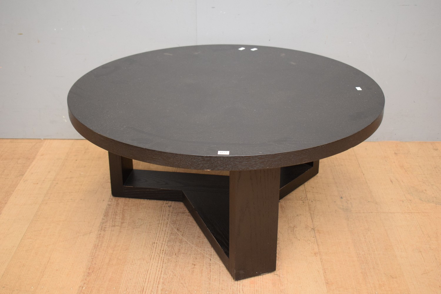A CONTEMPORARY BLACK CIRCULAR COFFEE TABLE ( 40H X 90 DIAMETER )(LEONARD JOEL DELIVERY SIZE: LARGE)