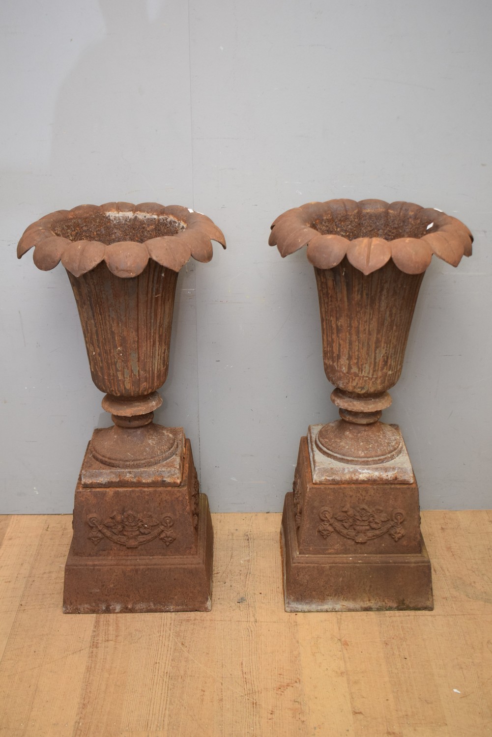 A PAIR OF CLASSICAL STYLE CAST IRON URNS ON BASE WITH LEAF DECORATION (A/F) (103H x 52D CM) (PLEASE NOTE THIS HEAVY ITEM MUST BE REMOVED BY CARRIERS AT THE CUSTOMER'S EXPENSE. LEONARD JOEL STAFF CANNOT ASSIST CARRYING THIS ITEM) (X-LARGE ITEM)