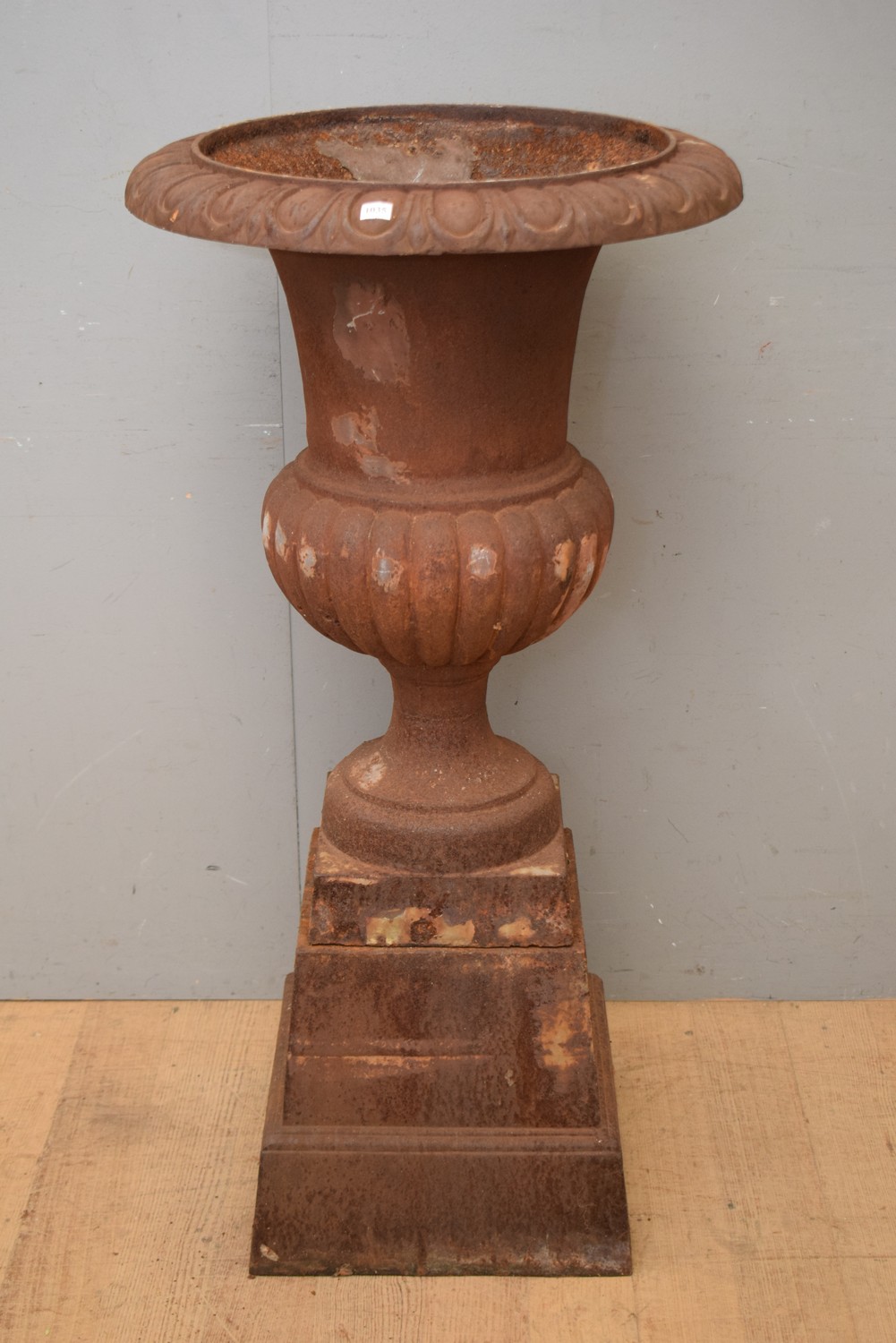 A LARGE CLASSICAL STYLE CAST IRON URN ON BASE (113H X 58W CM) (PLEASE NOTE THIS HEAVY ITEM MUST BE REMOVED BY CARRIERS AT THE CUSTOMER'S EXPENSE. LEONARD JOEL STAFF CANNOT ASSIST CARRYING THIS ITEM) (X-LARGE ITEM)