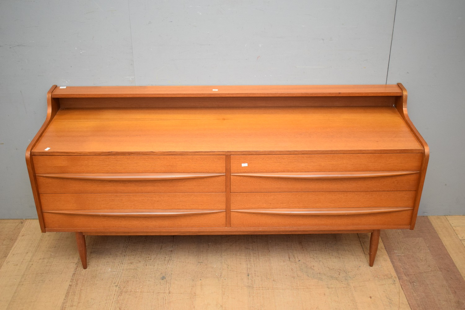 A MID-CENTURY TEAK FOUR DRAWER SIDEBOARD (71H X 153W X 46D CM) (PLEASE NOTE THIS HEAVY ITEM MUST BE REMOVED BY CARRIERS AT THE CUSTOMER'S EXPENSE. LEONARD JOEL STAFF CANNOT ASSIST CARRYING THIS ITEM) (X-LARGE ITEM)